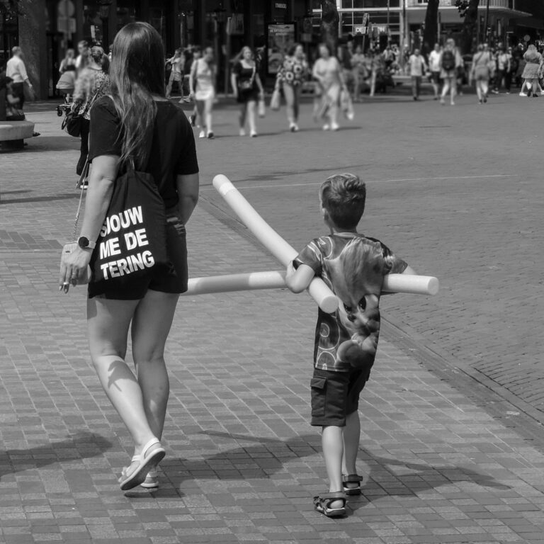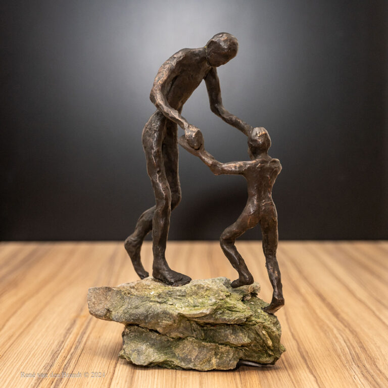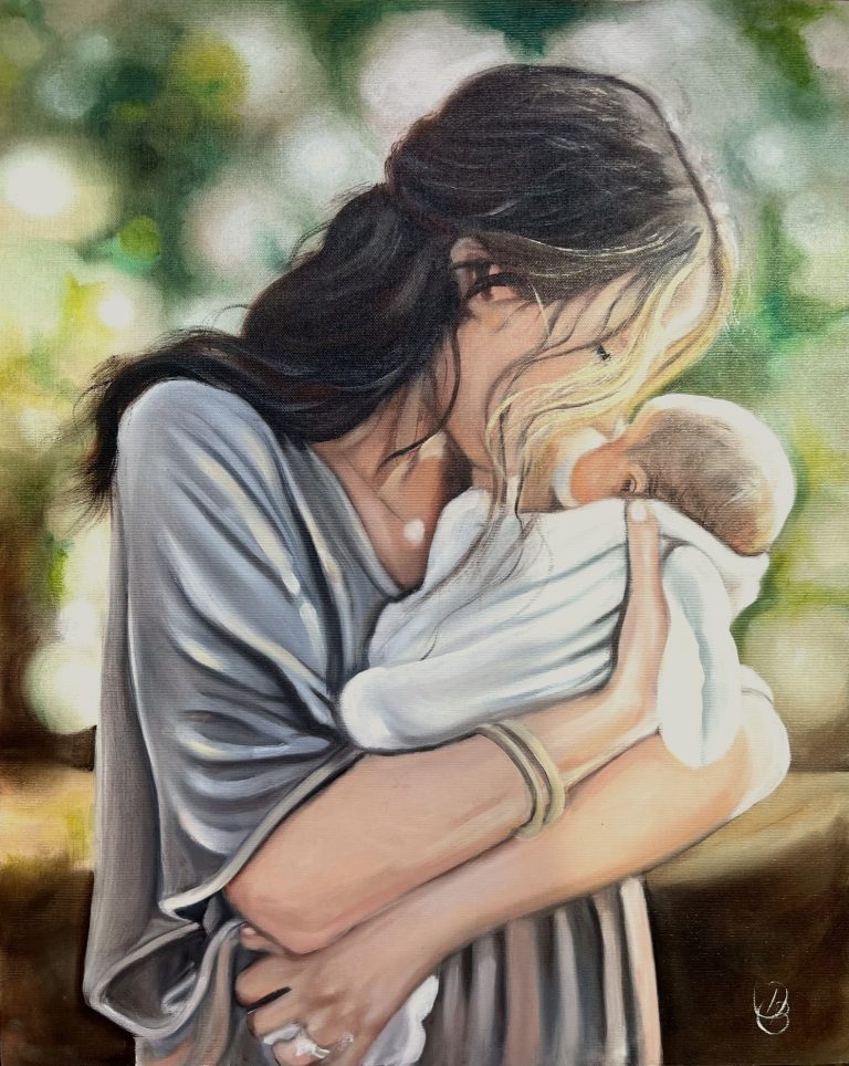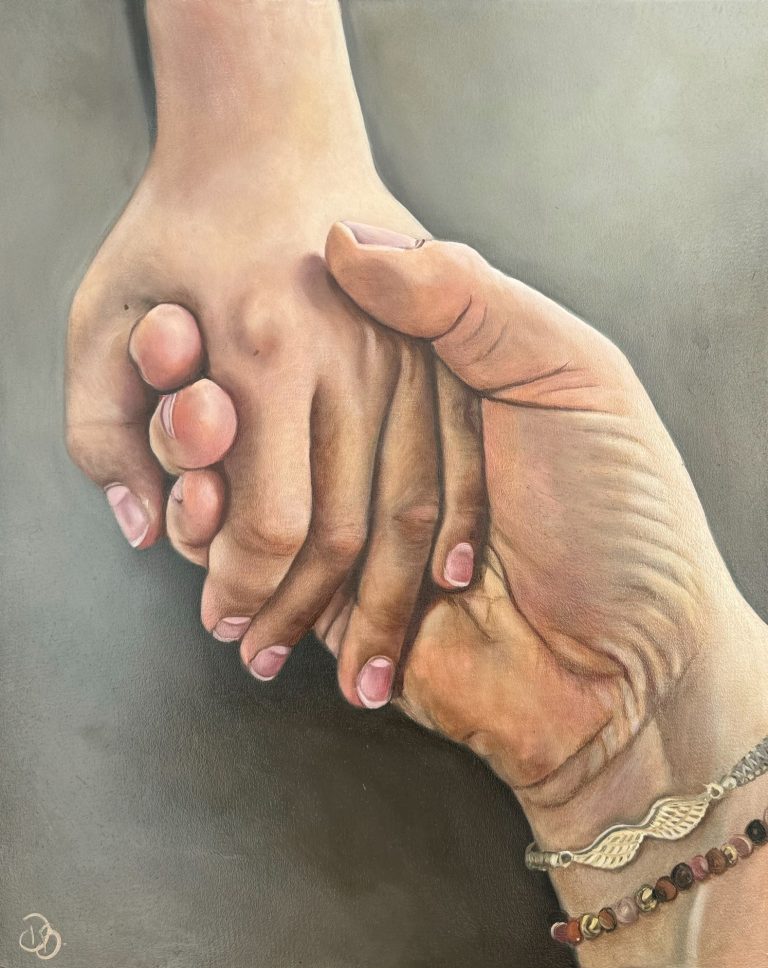 Olieverf op hout 50 x 40 cm Terwijl de moeder naast haar tienerzoon loopt, pakt ze zachtjes zijn hand vast. Ze kan …