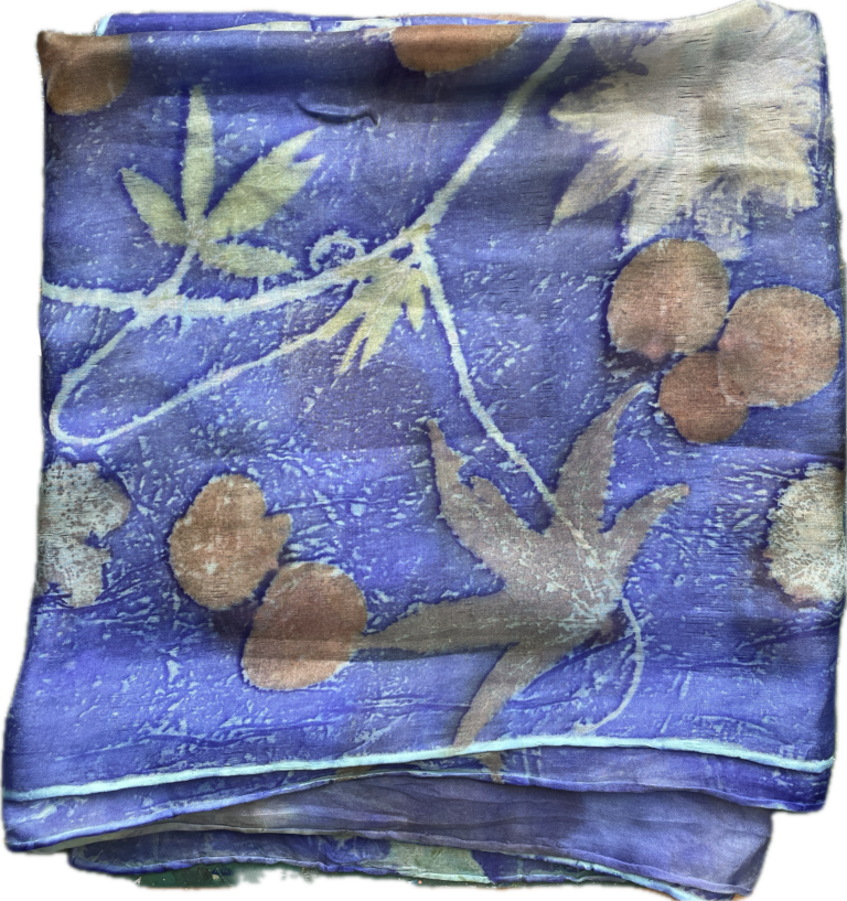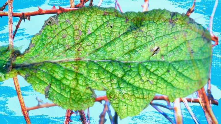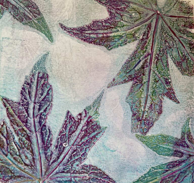 Ecoprint van braamblad op aquarelpapier, afmeting 10×10 cm.
