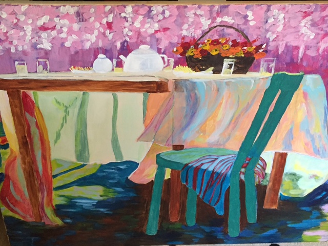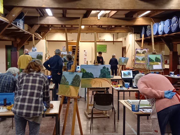 De maandagavondgroep heeft gezamenlijk een landschap geschilderd. In stappen opgebouwd door de docent begeleid.
