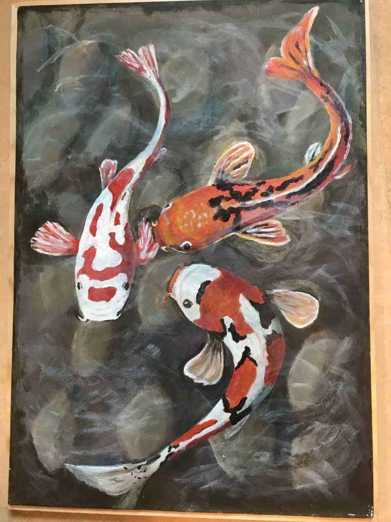 Dit schilderij toont twee Siamese kempvissen die elkaar gracieus naderen, als in een dans. De ene straalt in vurige rood-oranje tinten, terwijl …