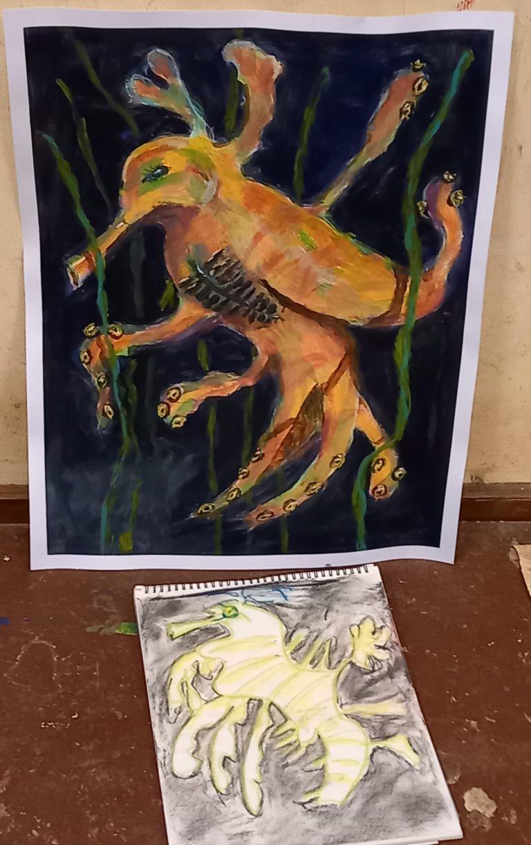 De veranderende natuur – het prachtige zeedraakje eerst geschetst en daarna in acryl op papier geschilderd