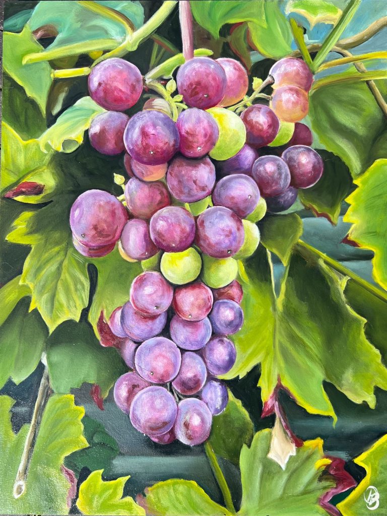 Olieverf op hout 40 x 30 cm Als ik uit het raam van mijn atelier kijk, zie ik een prachtige druiventros die …
