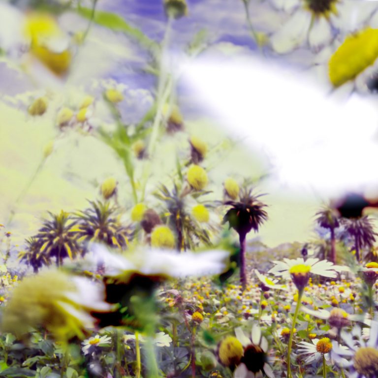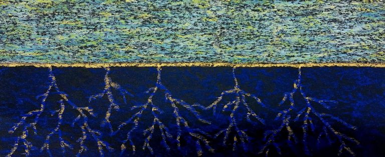 100 x 50, acryverf en mixed media op linnen In my field of paper flowersAnd candy clouds of lullabyI lie inside myself …