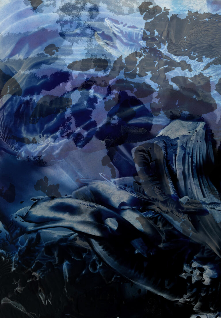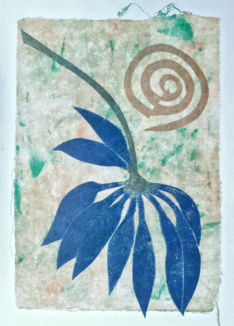 monotype, 21/28 cm 2021 De exotische bloemvorm, onderdeel van de Serie Botanical Blue, getekend, uitgeknipt en ingeïnkt is afgedrukt op de grondvorm, …