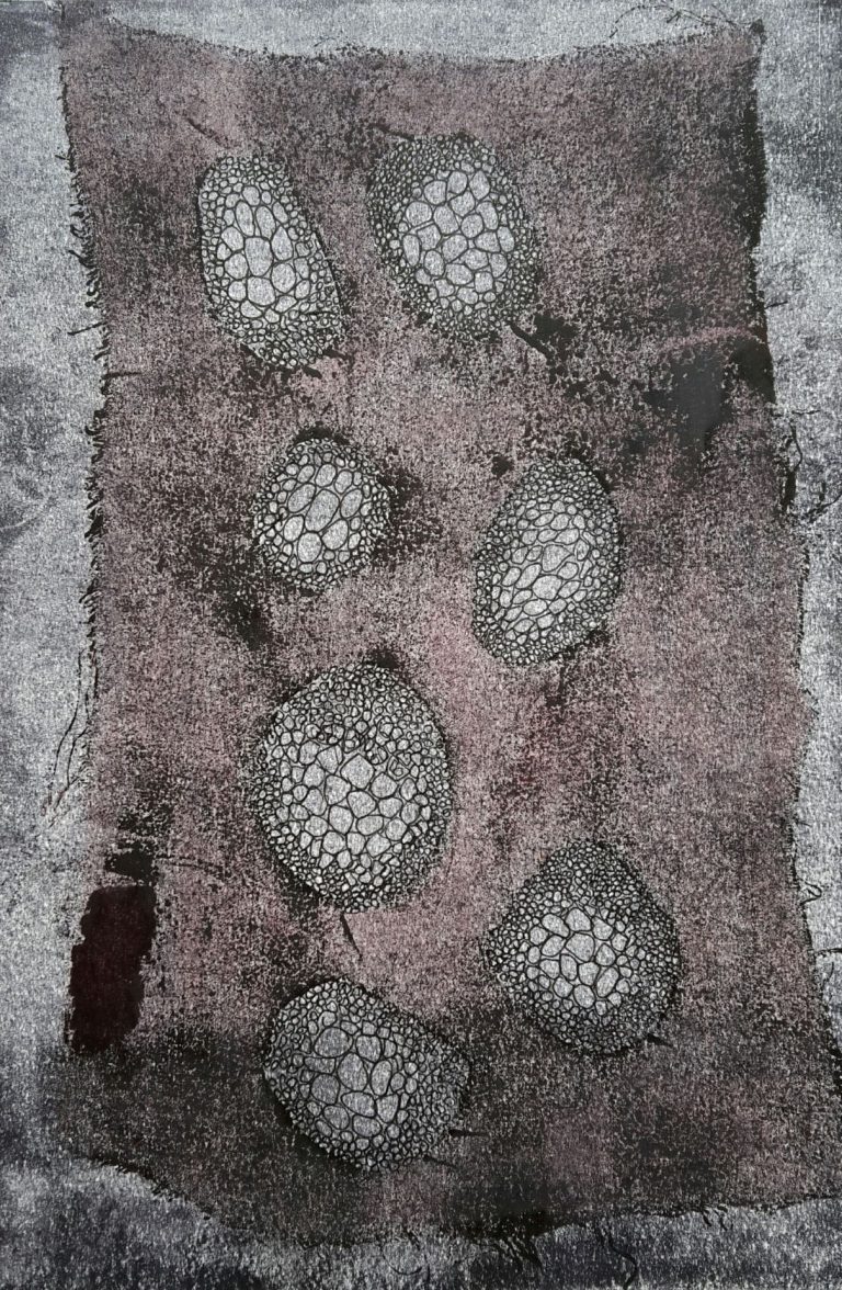 Gelaagde print van gedroogde eucalyptus takken; acrylverf, afbeelding 30×35