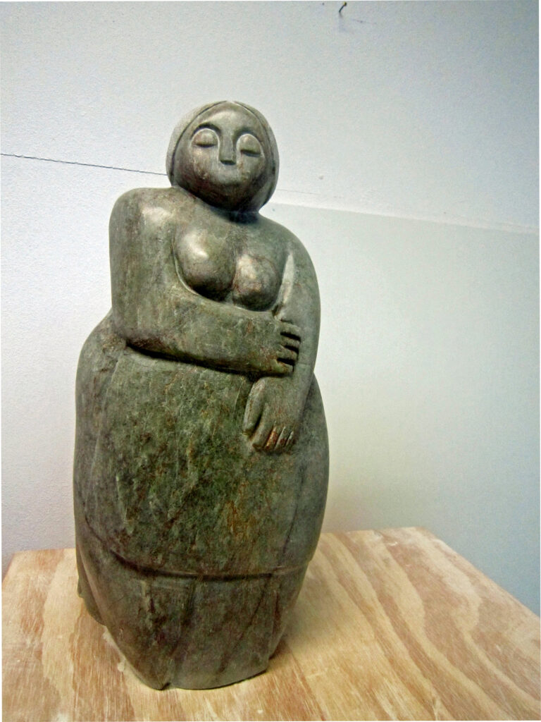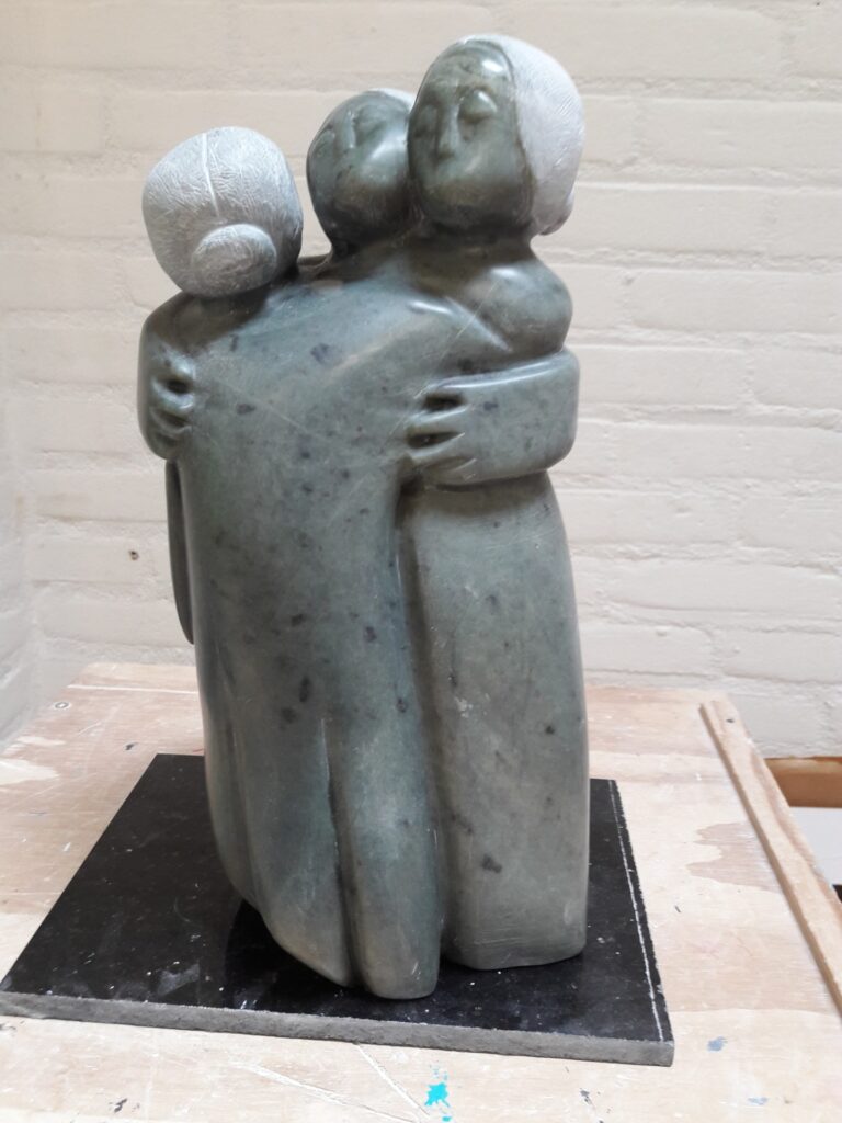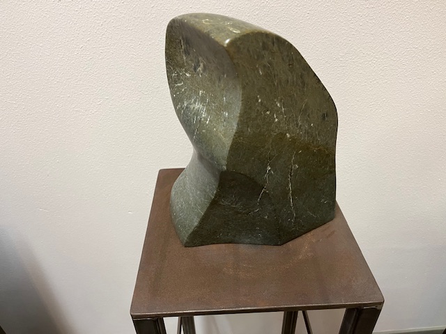 Speksteen op eiken plaat.Formaat (h x b x d) in cm: 40 x 35 x 20 Dit beeld ontstond in het werk