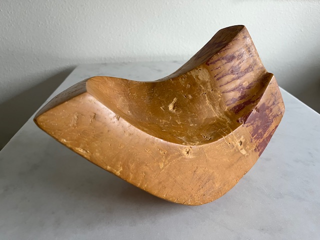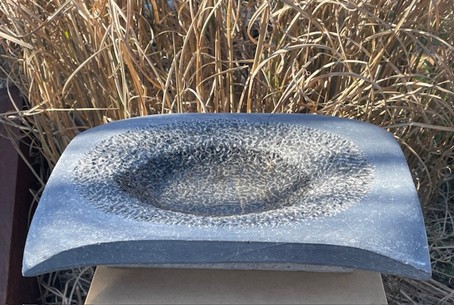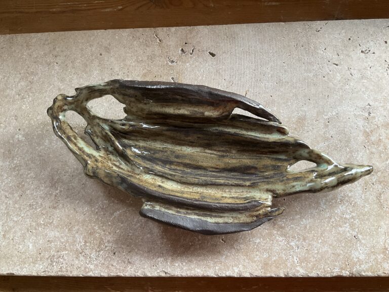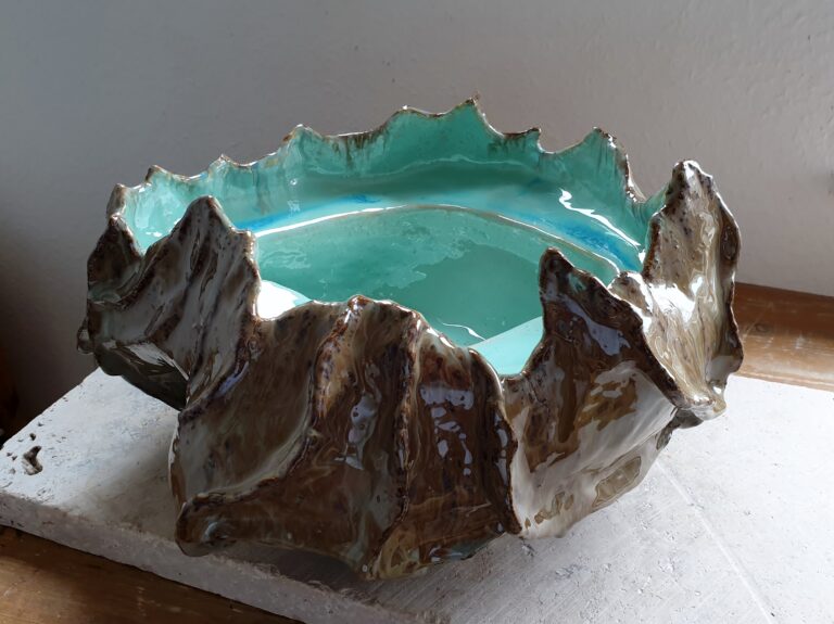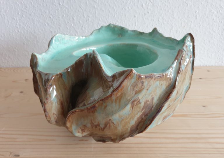 Een schaal als een bocht in een rivier. Keramiek  lbh 21x23x13 cm