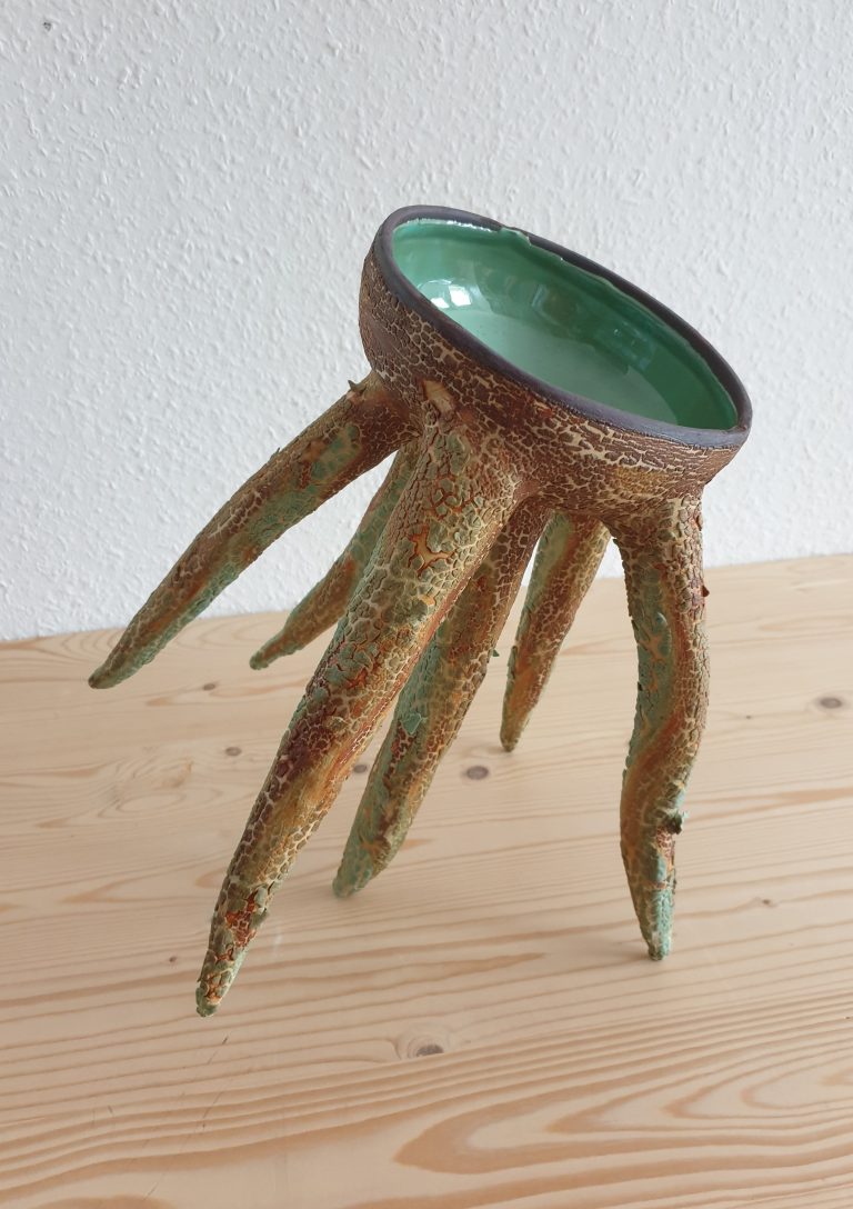 Komloper, zich elegant voortbewegend op haar 9 bontgekleurde pootjes. Keramiek, gedraaide kom Ø 12,5 cm.  lbh 30x30x21 cm.