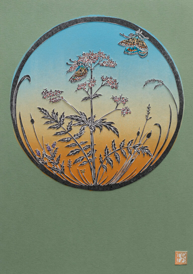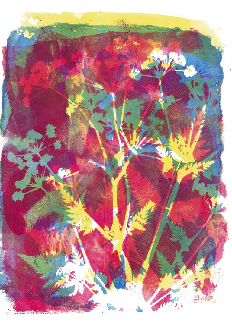 Gelaagde monoprint, met behulp van gelplaat techniek, robbertskruid en fluitekruid in bonte uitvoering, in lijst met passepartout.