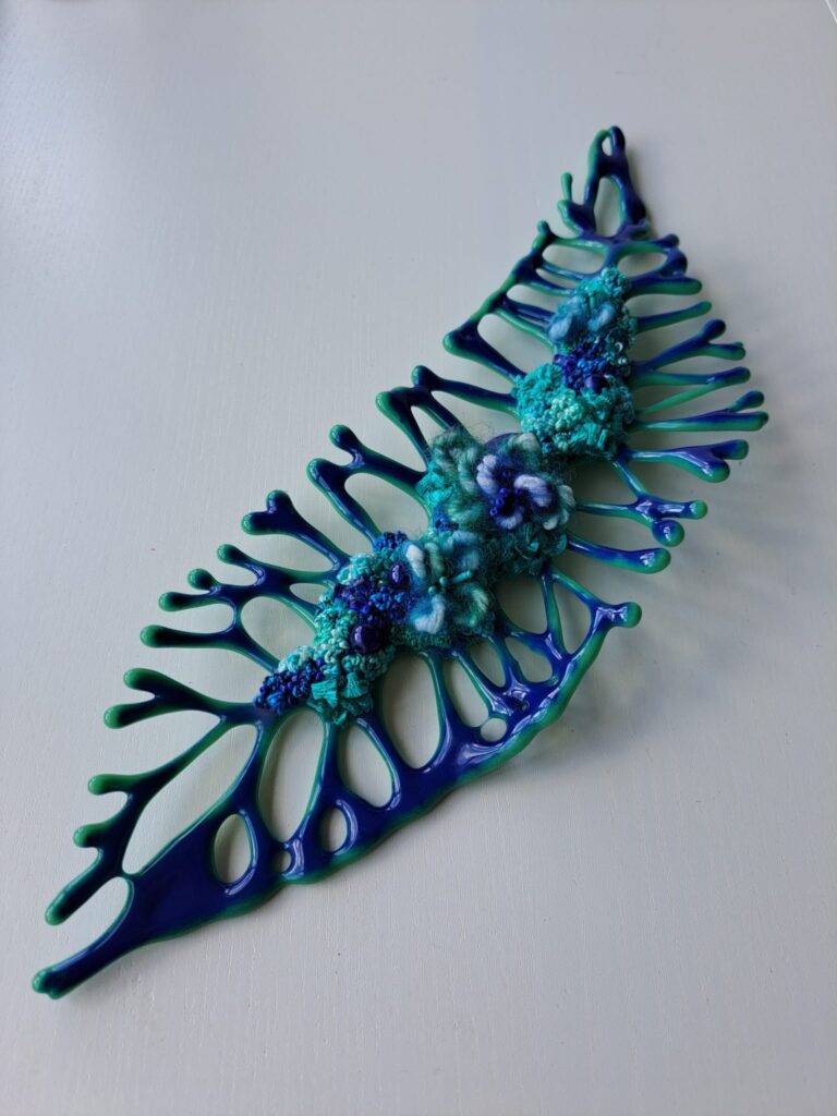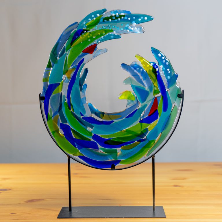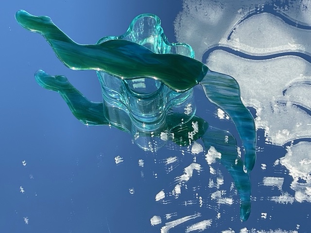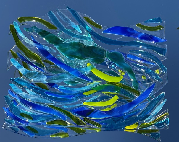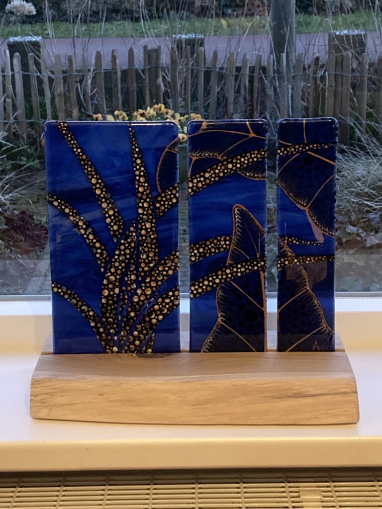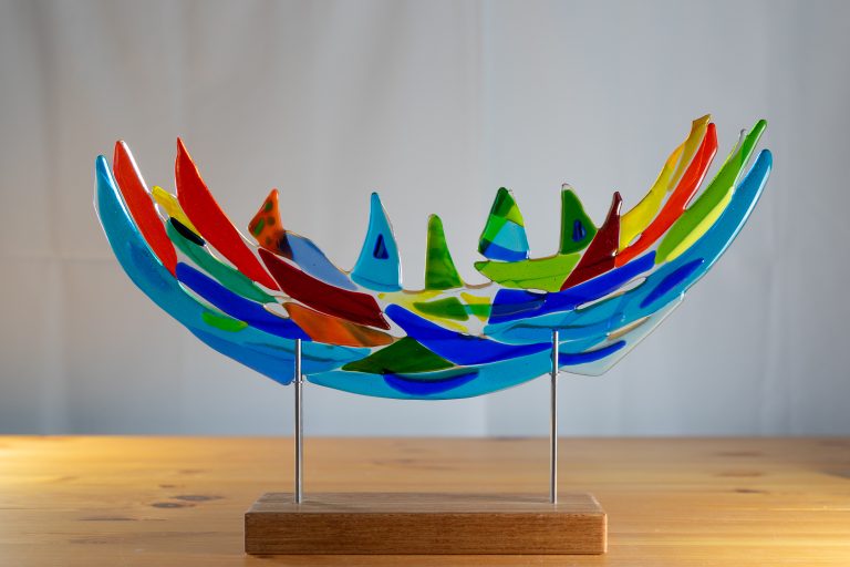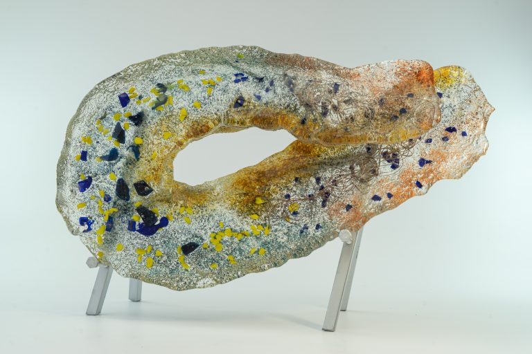 Glasfusingwerk in combinatie met borduurwerk. Afmeting: 30×12 cm. Een ‘bundeling van krachten’ met mijn dochter Suzanne (de draadfanaat; zie ook instagram)