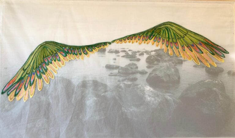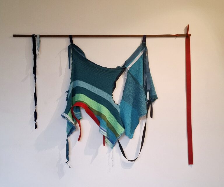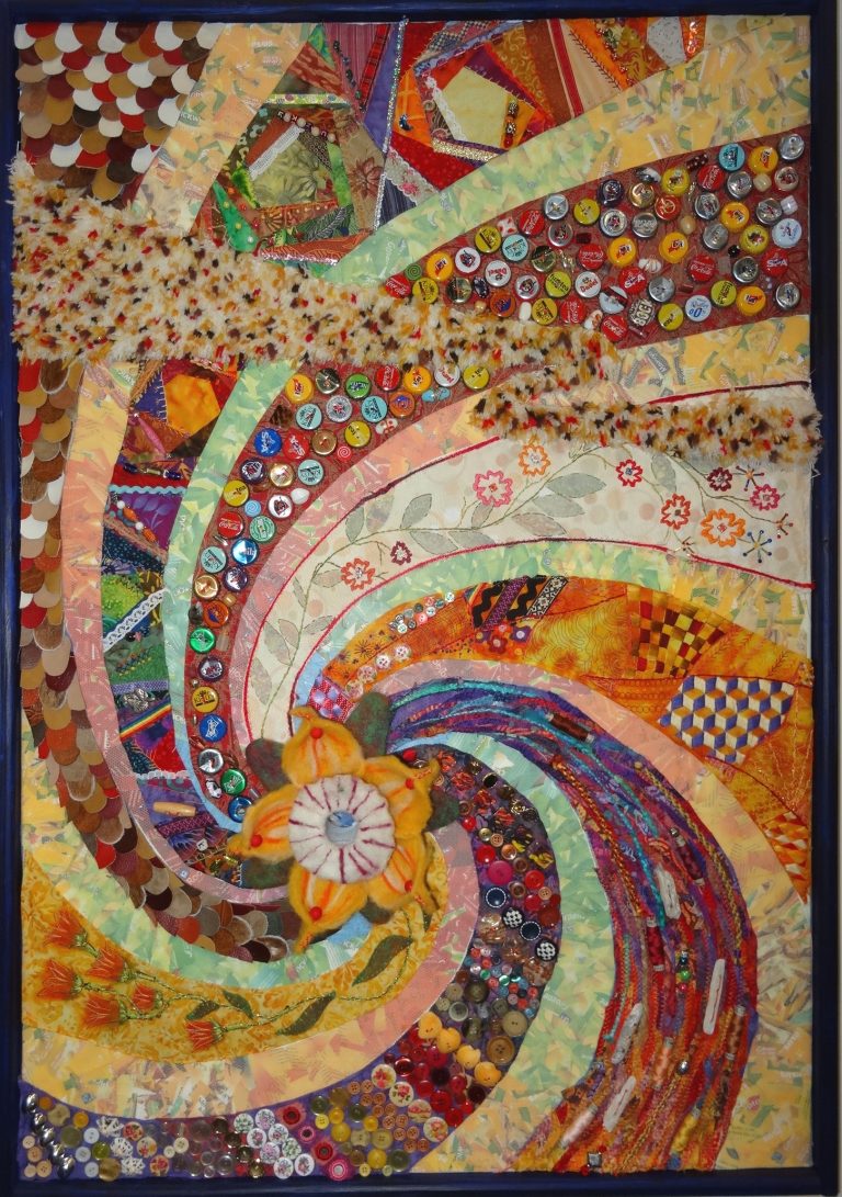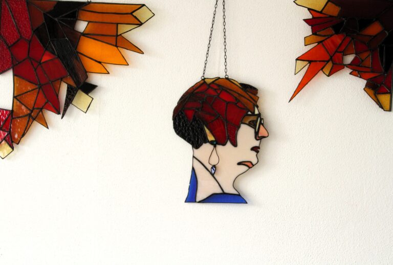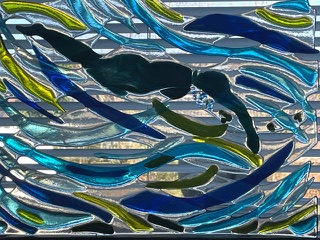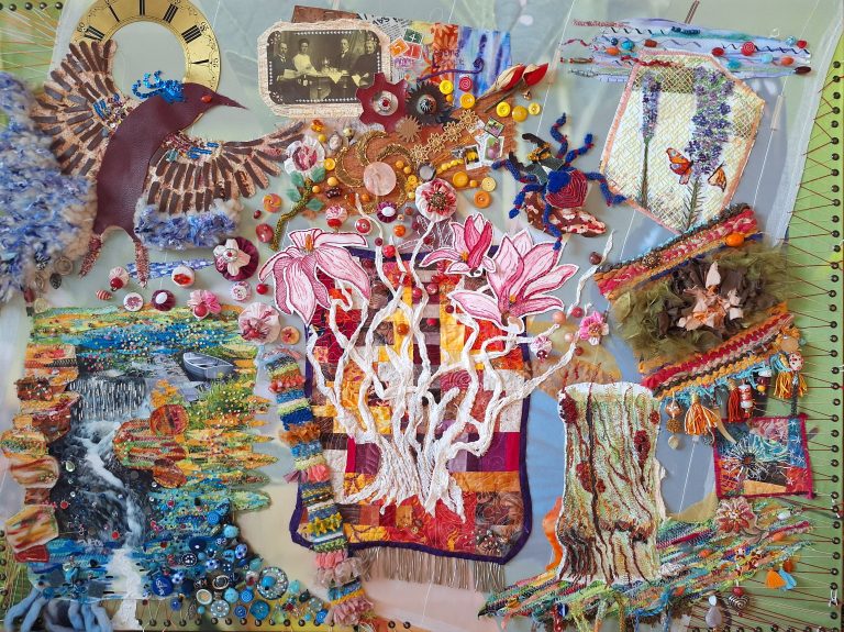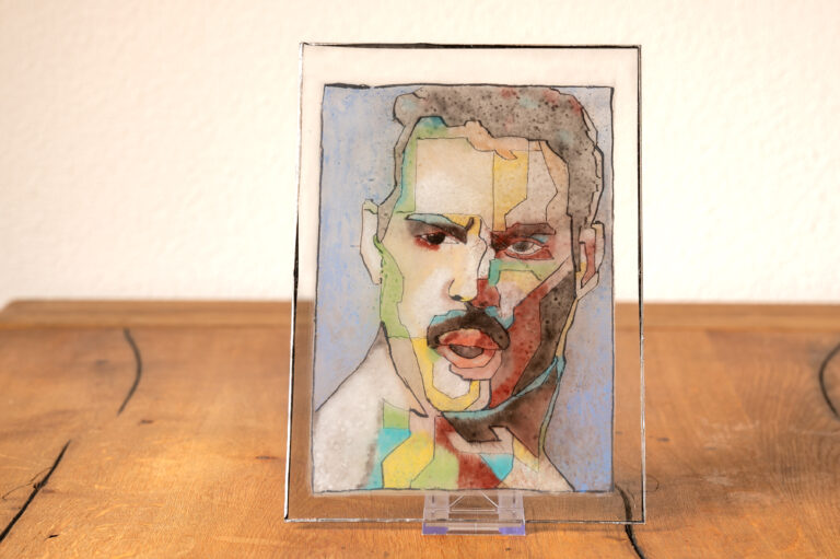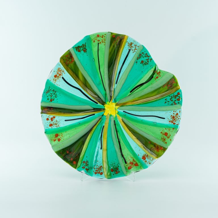 Glasfusingwerk in combinatie met borduurwerk. Afmeting: 30×12 cm. Een ‘bundeling van krachten’ met mijn dochter Suzanne (de draadfanaat; zie ook instagram)