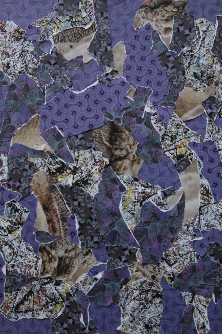 Printcollage, papier en linodruk. 90 x 122 cm (incl baklijst) Ooit kocht ik een groot vel papier bij de museale papier molen …