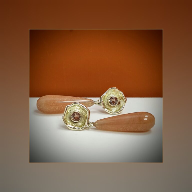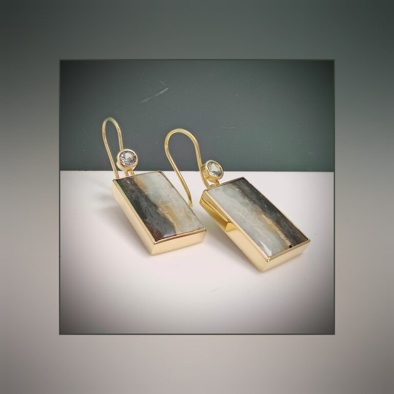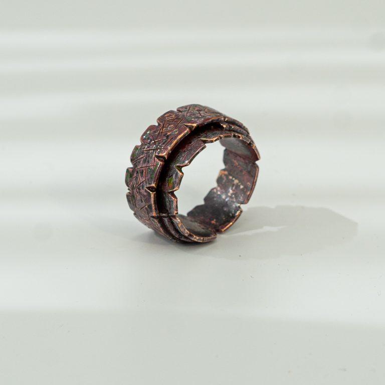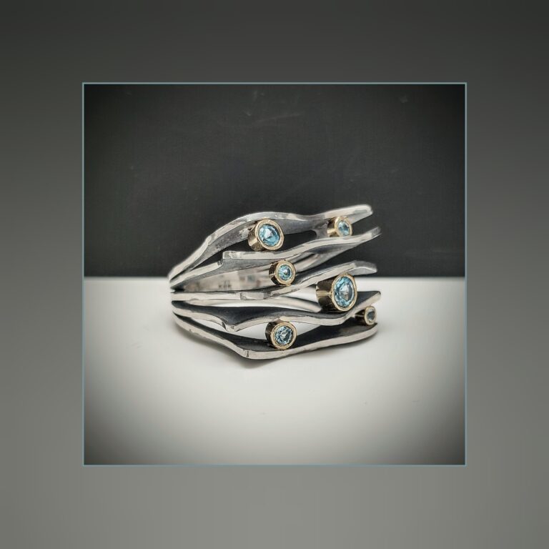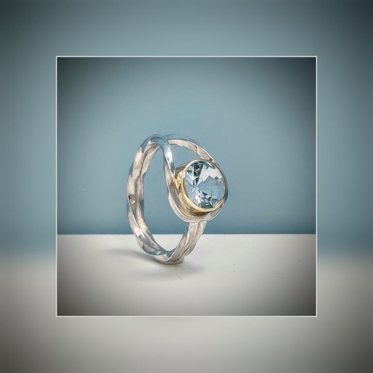 Bijzondere ring van geoxideerd zilver met topaas in gouden zetkastjes.