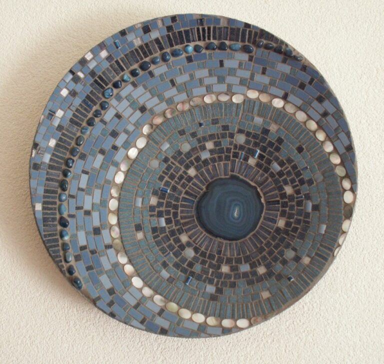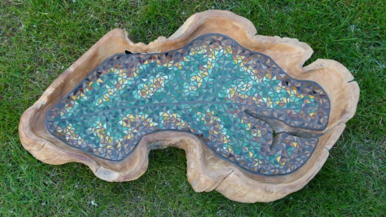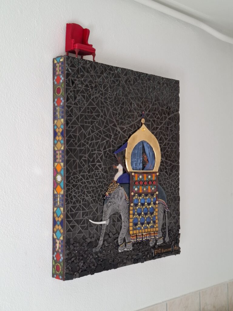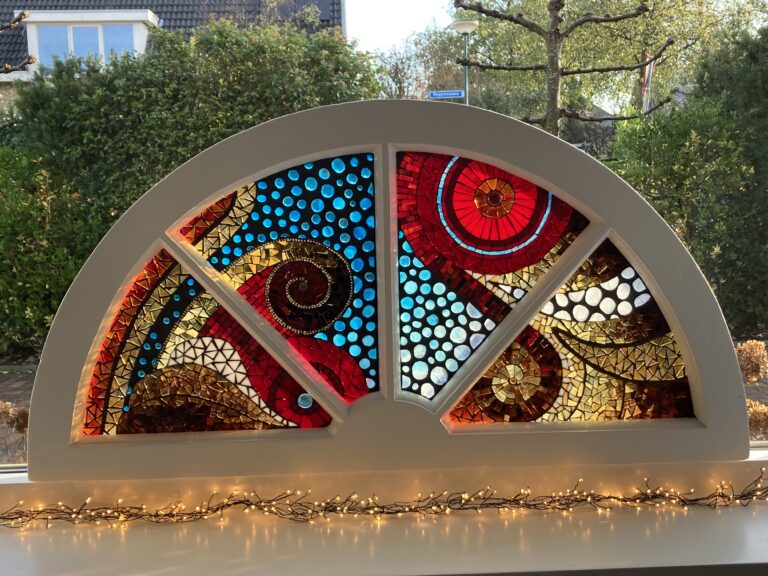 Mozaiek glas op glas. Afmeting: 100x50cm. Deel van het mozaïekmateriaal is gefused