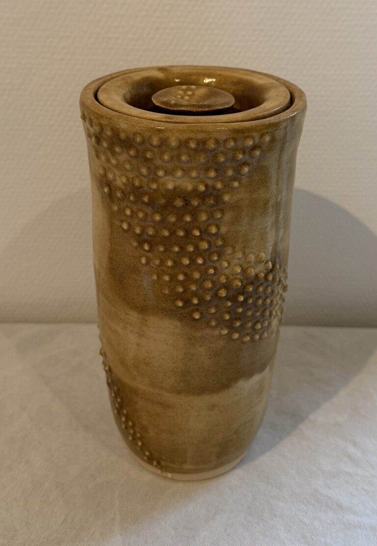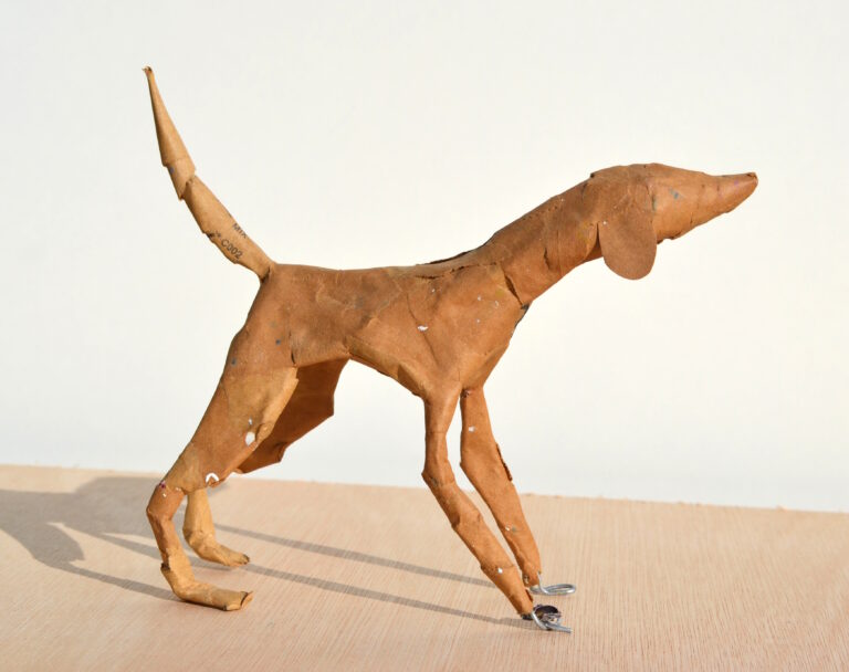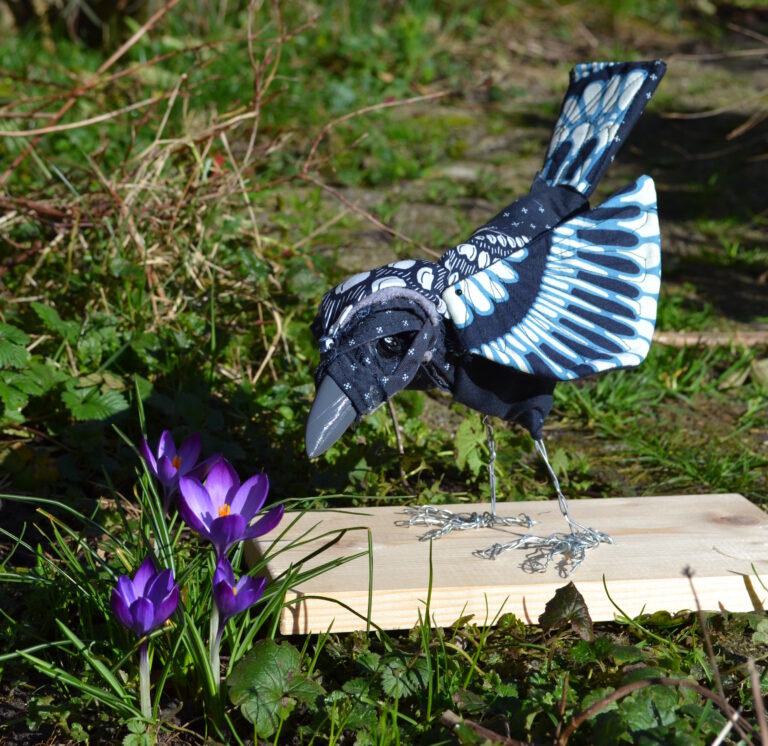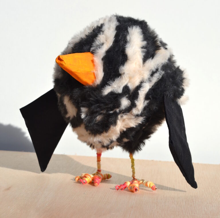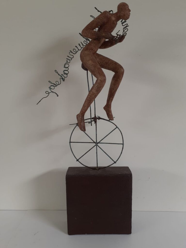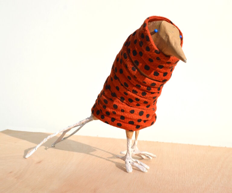Een Komloper, balancerend op zijn hoge ruige poten. Keramiek, gedraaide kom Ø 16 cm.  20x27x32 cm.