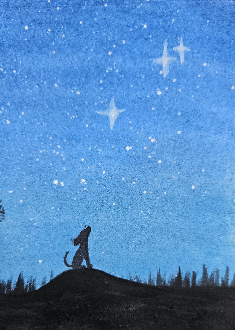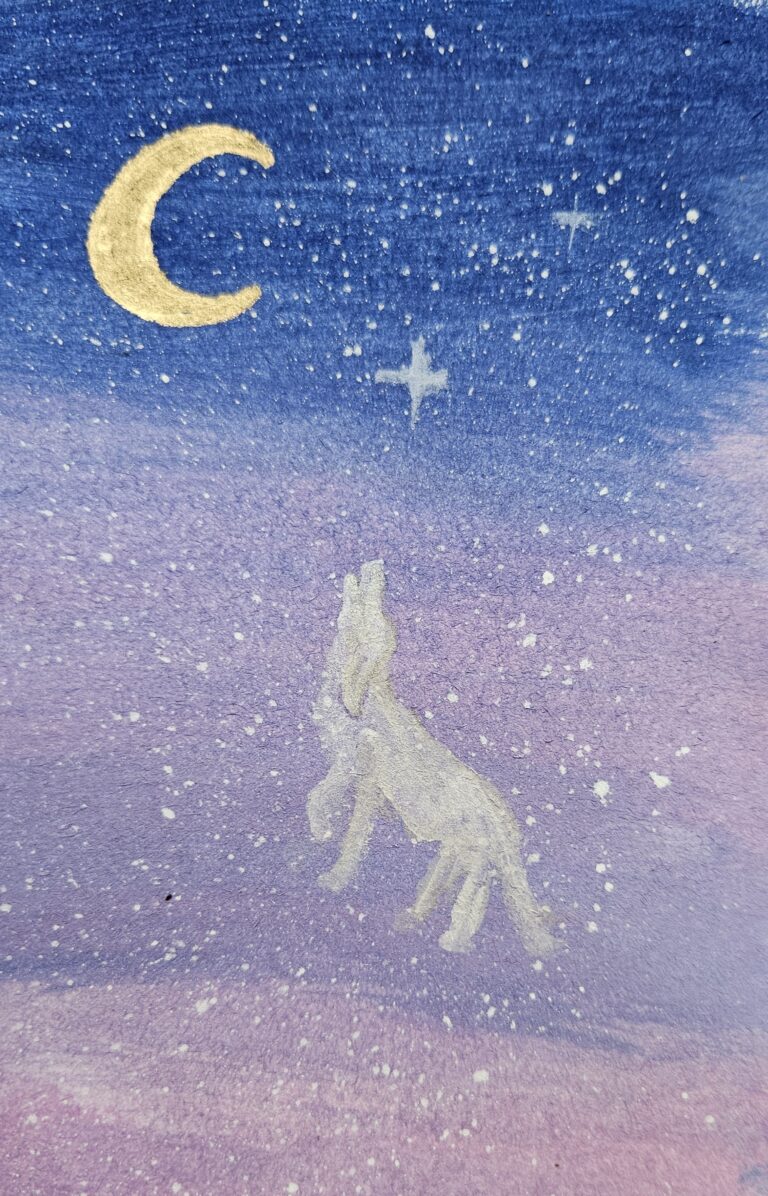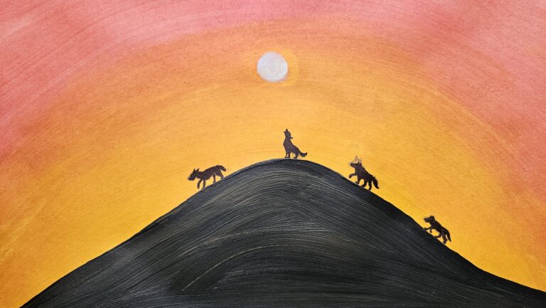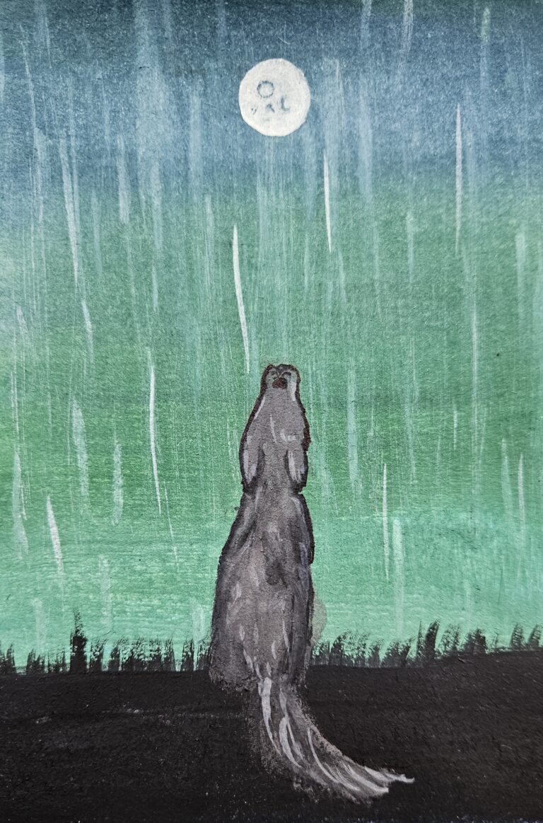 Een roedel wolven die om de beurt de heuvel op gaan en naar de maan huilen. Mixed media op papier, combinatie van …
