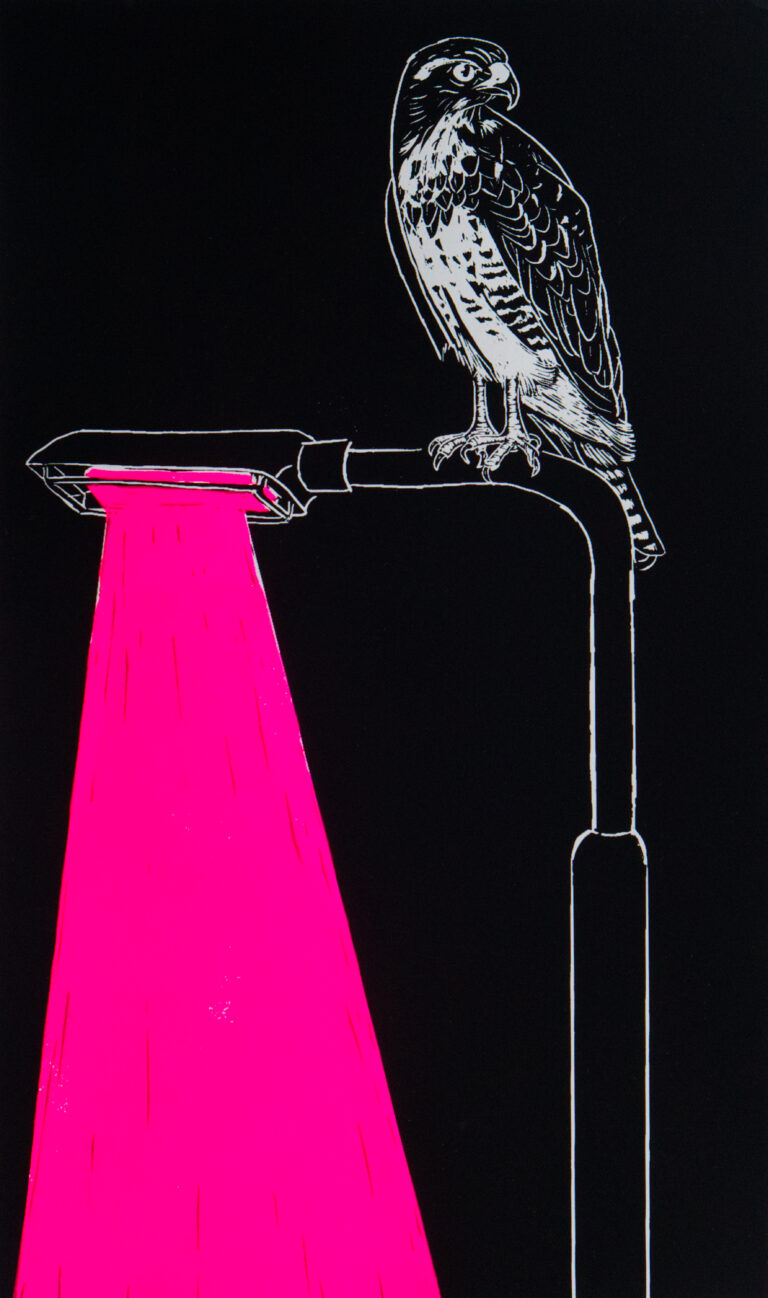 Zeefdruk op papier Buizerd is ontworpen als logo voor de band Buizerd. In het ontwerp voor de band heeft de lantaarnpaal een …