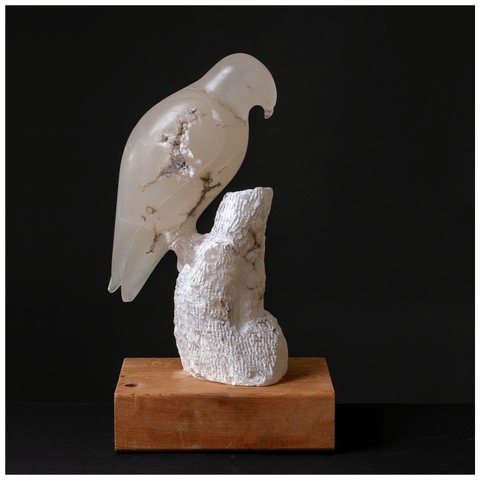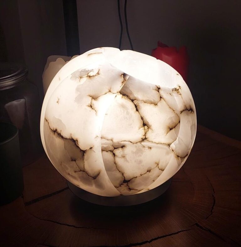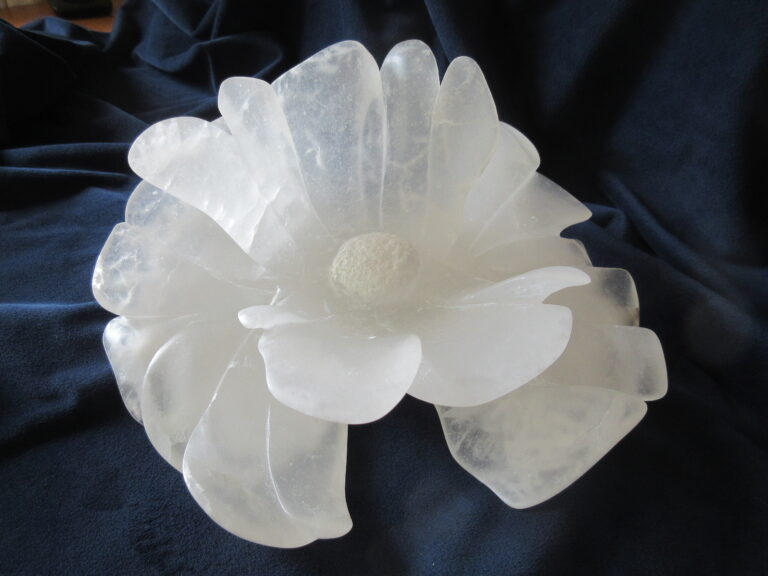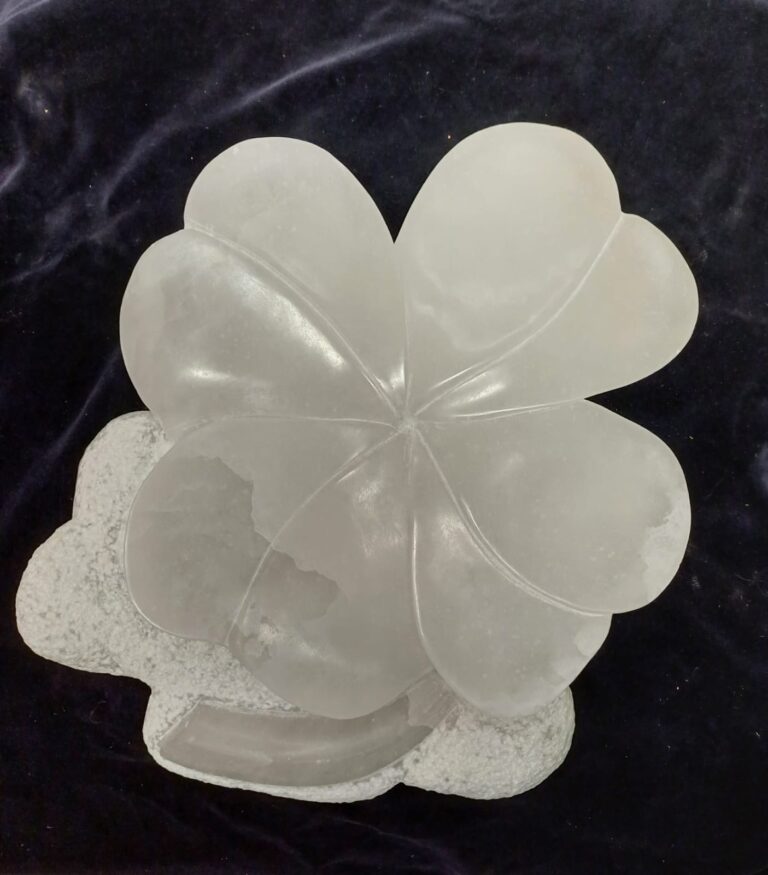 Een bloem gehaald uit transparante albast, in opdracht. Diameter is ongeveer 25 cm, hoogte 20 cm