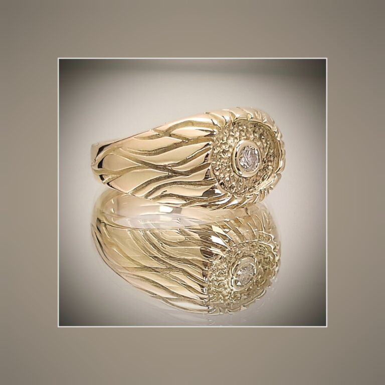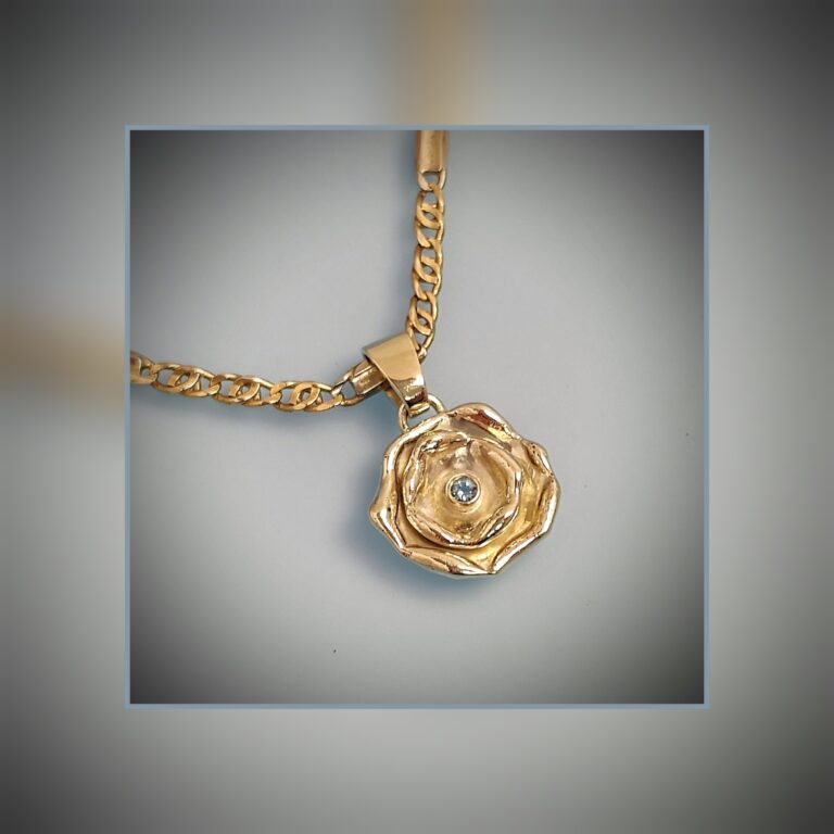 Gouden hangertje met ‘gesmolten’ randjes en een briljant geslepen Swiss blue topaasje.