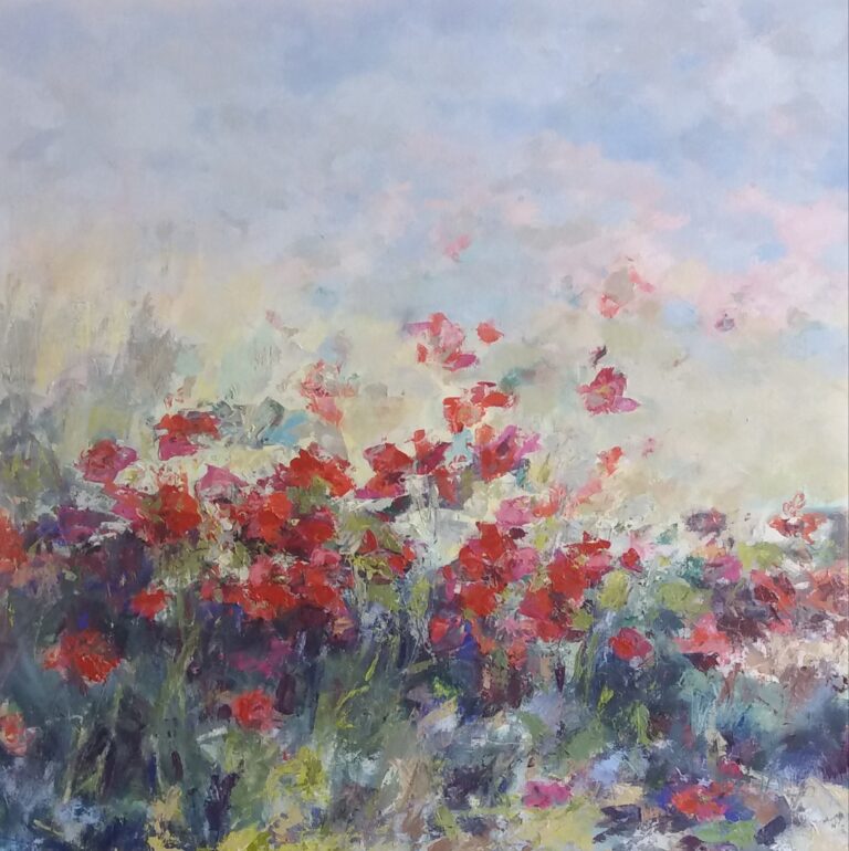 Het veld met klaprozen doet mij denken aan die mooie zomer. Acryl op linnen 50 x 60 cm