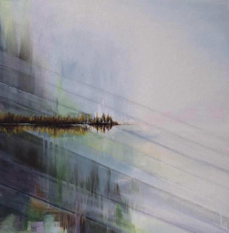 Geabstraheerd landschap, bomen aan de waterkant.Acryl op doek 50 x 50cm.