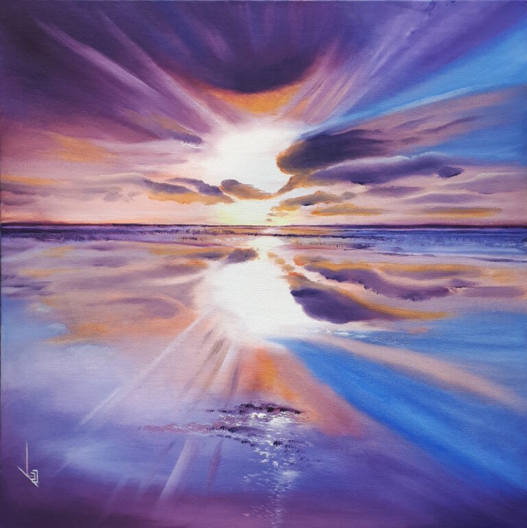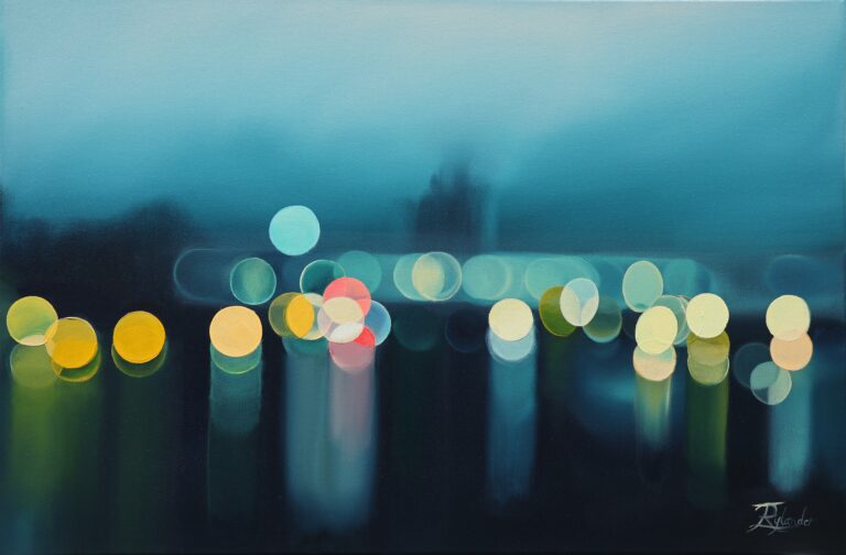 80 x 80 cm, acrylverf op canvas Het schouwspel van kleurige lichten wanneer je onderweg bent tijdens de donkere dagen. Dit schilderij …