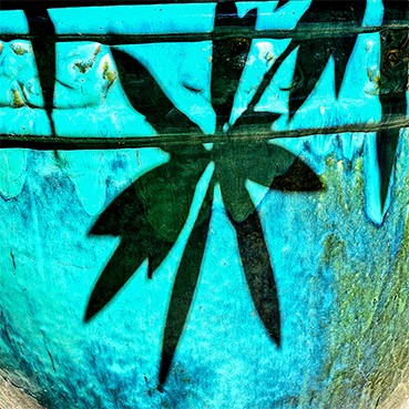Gelprint, acryl, van de bladeren van onze amberboom. Onderdeel van een serie met diverse kleurschakeringen. Afmeting 15×15.