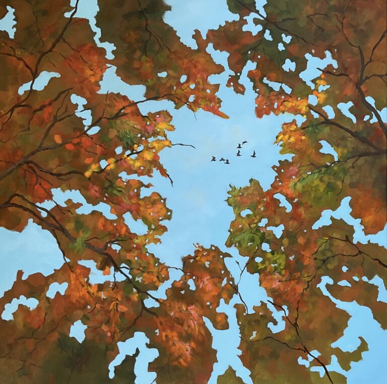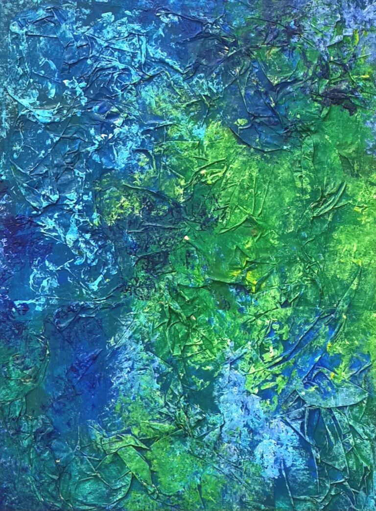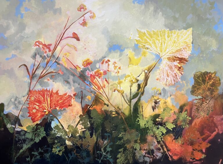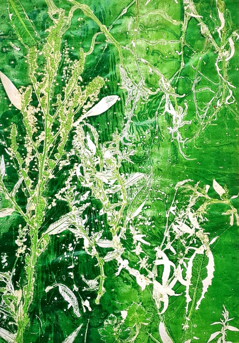 Tikje mysterieus is deze weergave van de natuur. Er is veel te ontdekken in het schilderij wat gelaagd is opgebouwd. Bladafdrukken in natte …