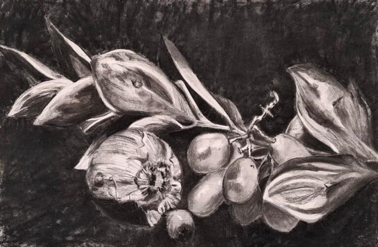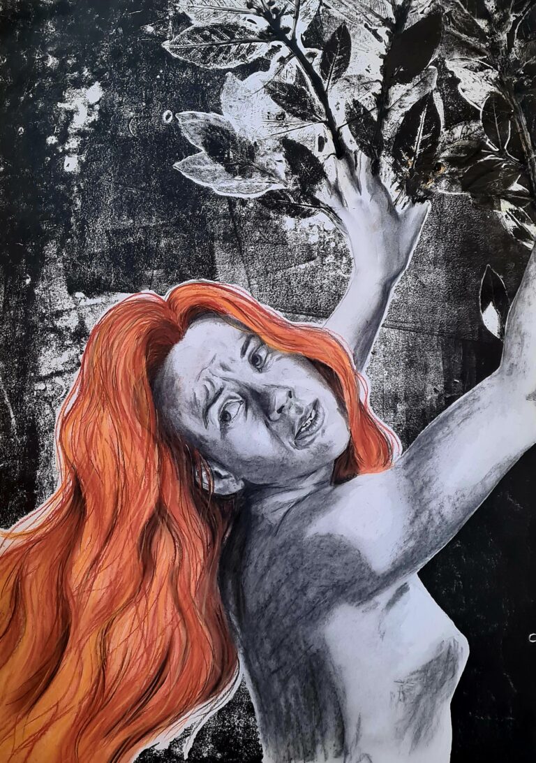 50x60cm op doek, houtskool, walnoot inkt en kalkverf.
