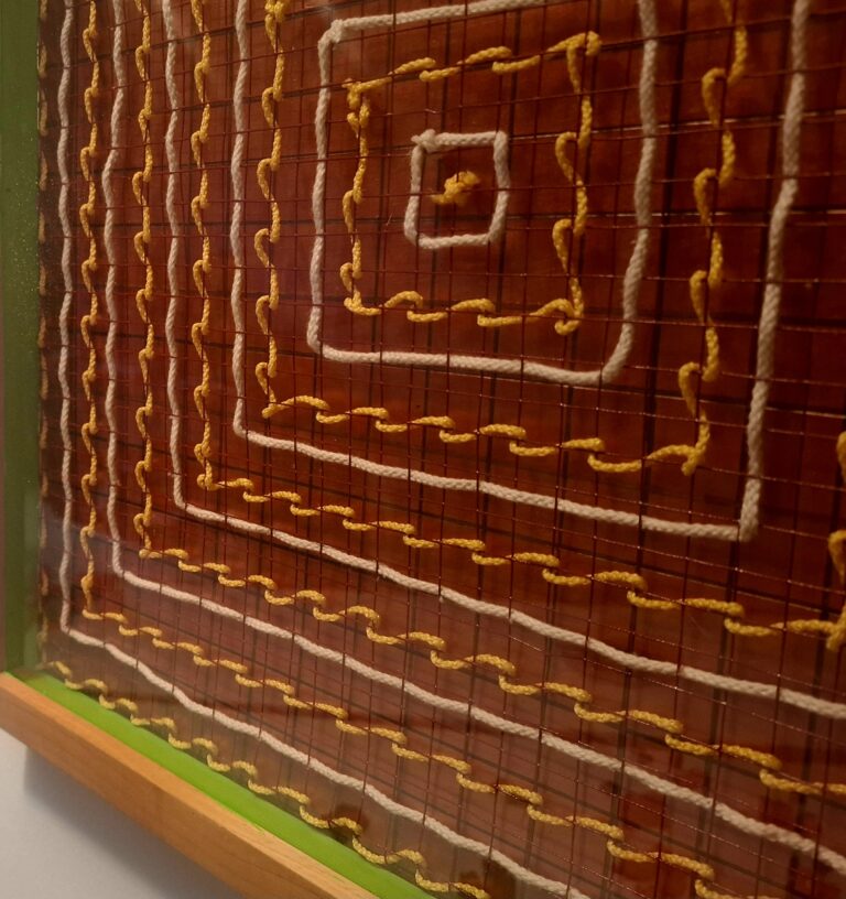 Een Ammoniet (fossiel) is de inspiratie geweest voor dit werk. De ondergrond van dit werk is gemaakt van theezakjes. Daarover heen een …
