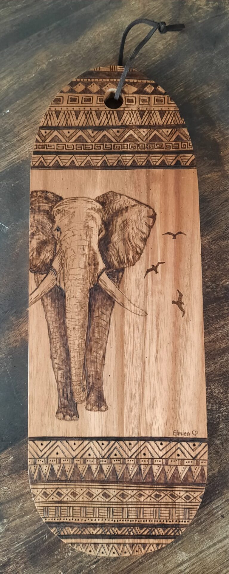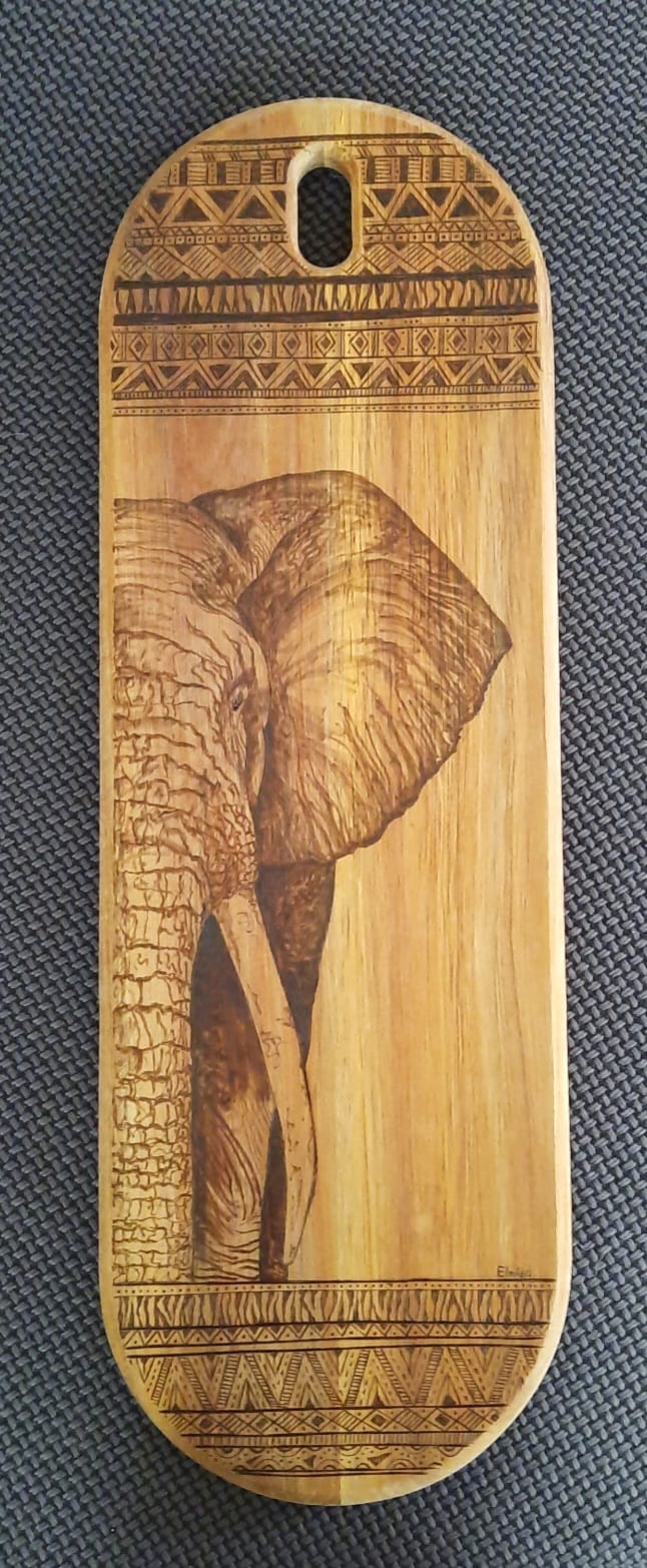Houten serveerplank – pyrografie De olifant is mijn favoriete zoogdier en blijft mij inspireren om het dier opnieuw te tekenen en te …