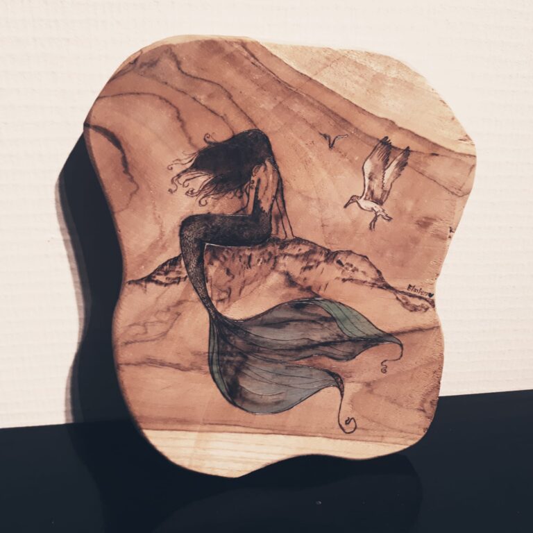 Houten paneel – pyrografie met kleuraccenten Deze meermin ontstond bijna vanzelf uit de lijnen van het hout. Tijdens het werken begon de …