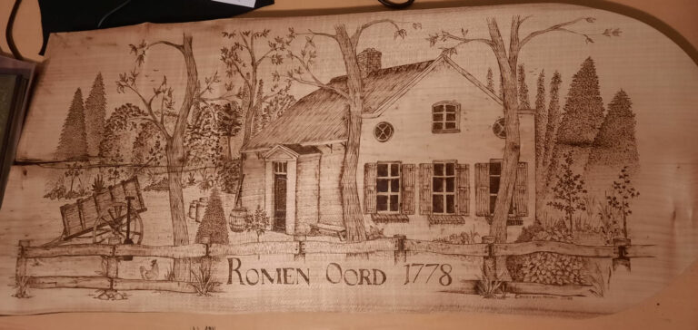Houten paneel – pyrografie Dit werk ontstond in opdracht van een familie die hun huis recent had gerestaureerd. Zij vonden een oude …