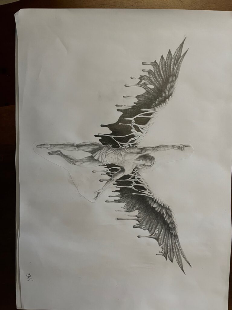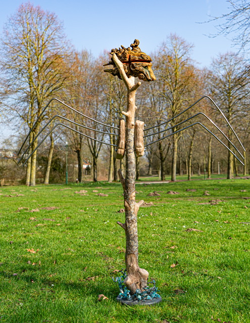 Vleugels als een verweerd stukje hout. Keramiek lbh 30x13x6 cm