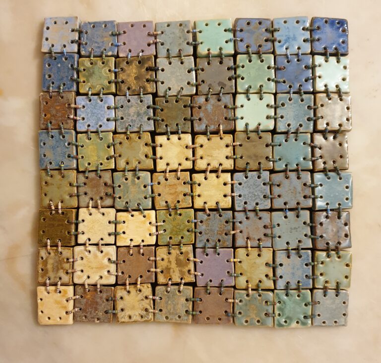 Weerstandjes als kleurig bindmiddel tussen 64 tegeltjes. Keramiek,  lb 23 x 23 cm.