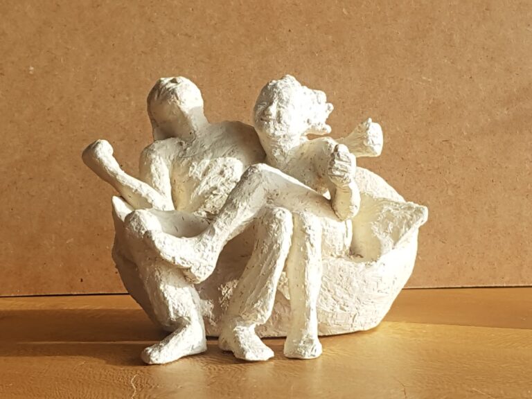 Twee figuren, man en vrouw,  in wisselwerking aan elkaar verbonden maar toch ook autonoom. Terracotta van witbakkende chamotte klei. Grondvlak 14×12 cm, …