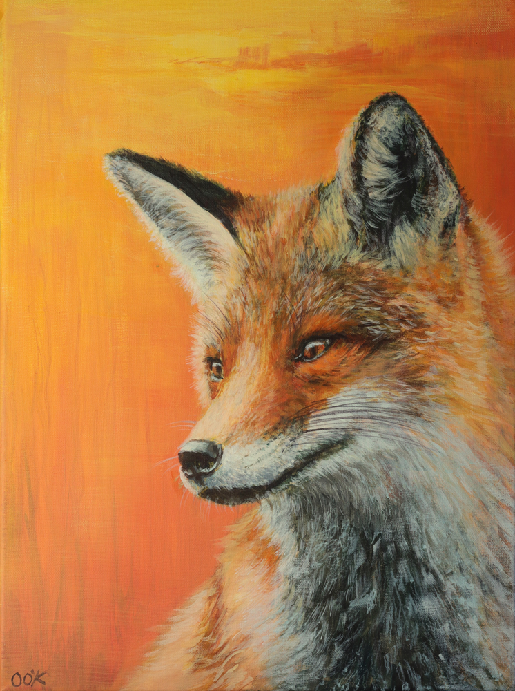 Fidge, de vos (50×70 cm), zit kalm op een boomstam, zijn oranje vacht contrasterend met de zachte achtergrond.Met acrylinkt, airbrush en kleurpotlood …