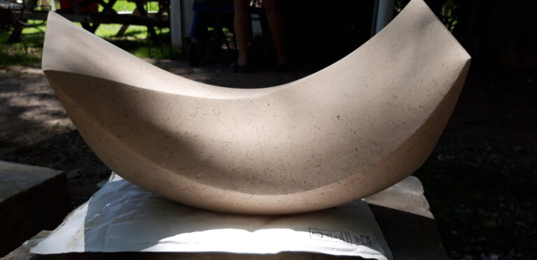 Uitgesleten door het water blijft een diep spoor achter. Keramiek, dubbelwandige schaal. Lbh 30x30x16 cm.