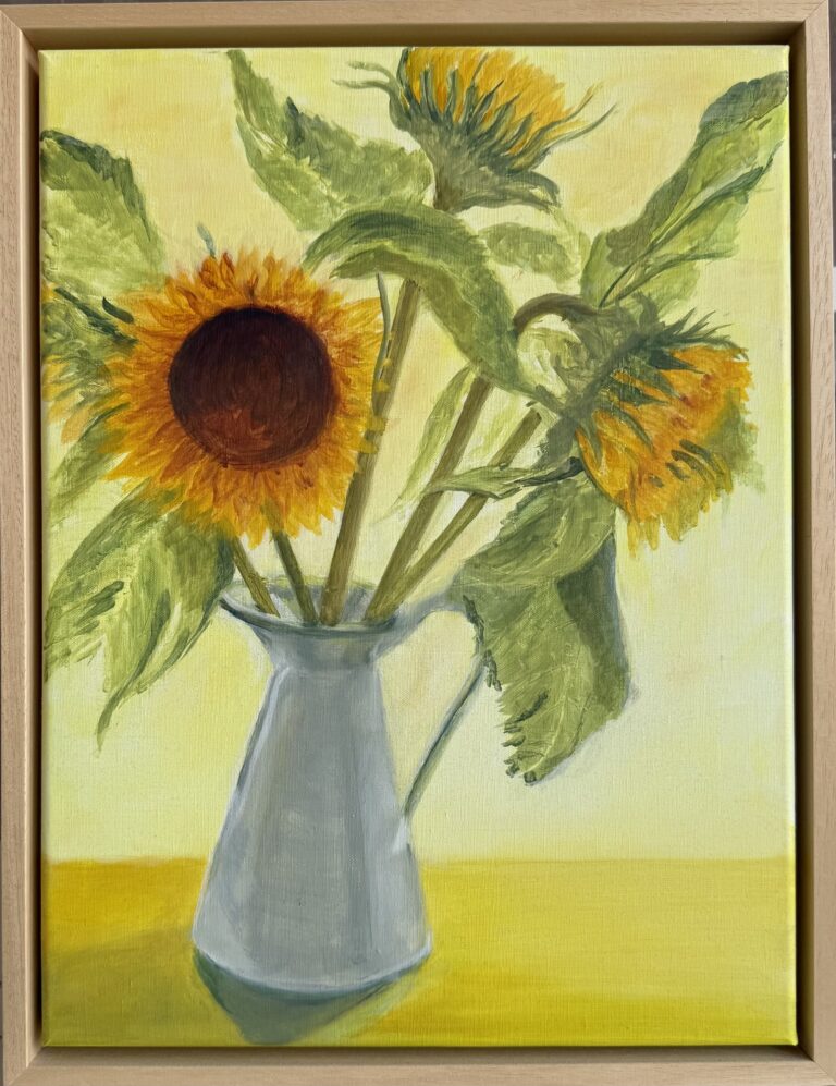 Velden met majestueuze zonnebloemen zijn ook in Nederland steeds vaker te vinden.Acryl op doek 50 x 60 cm.