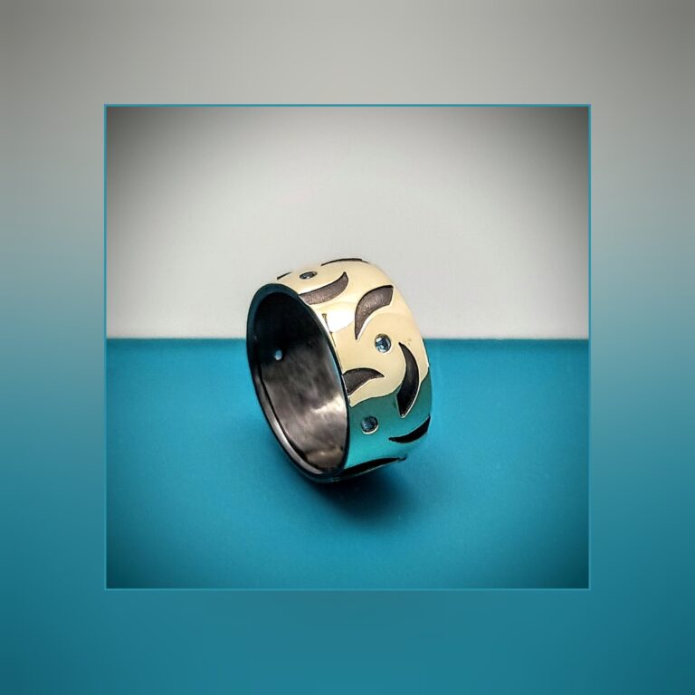 Als een ring van eilandjes  rijst deze schaal op uit de zee. Hij behoort tot de Zeeschalen. Keramiek, dubbelwandige schaal. 30x31x20 cm.
