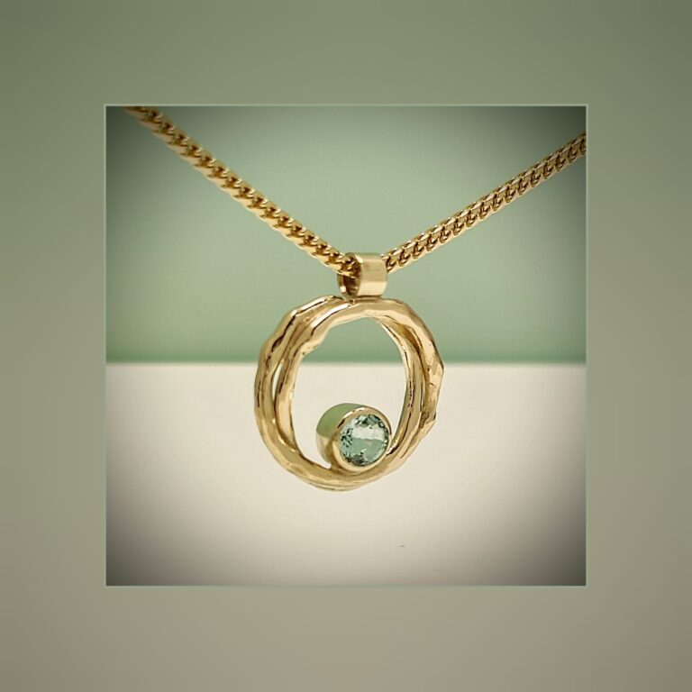 Gouden oorhangers met perzikkleurige maansteen. De stekertjes zijn voorzien van ‘gesmolten’ randjes en briljant geslepen andalusiet.