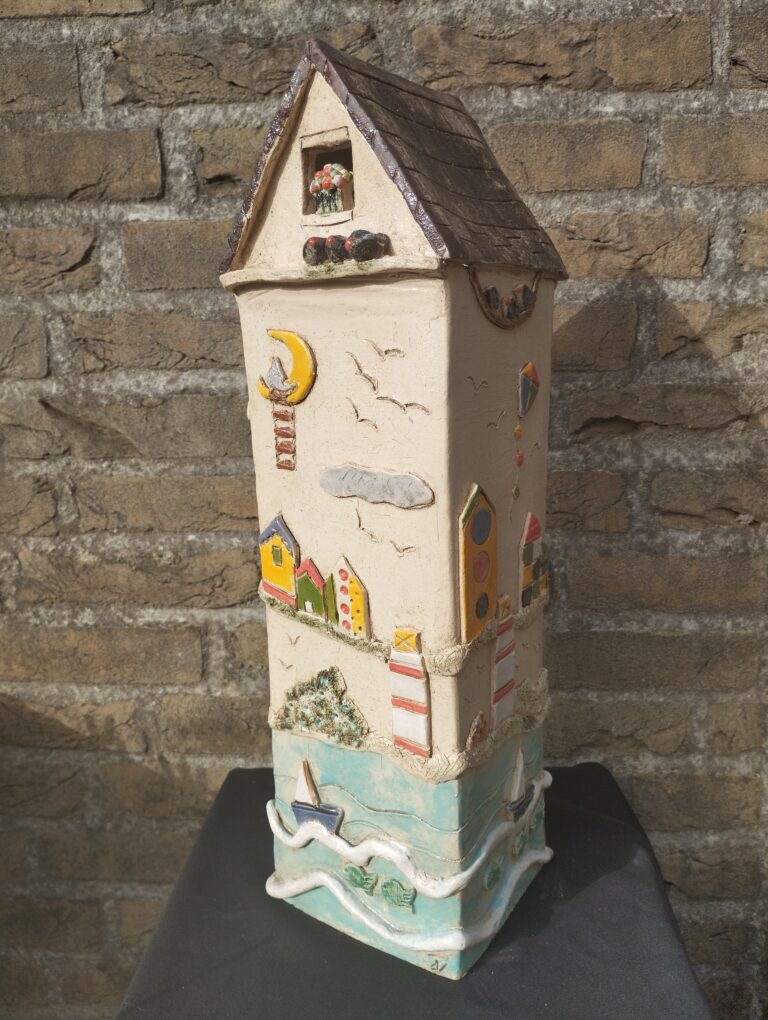 Een groepkunstwerk van de donderdagavondgroep. Zij werken ruimtelijk. Vaak met klei, soms met papier, karton of ander materiaal. Elke deelnemer maakte een …