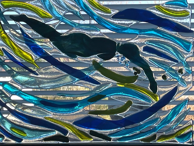 Glasfusing werk op oude houten snijplank. Afmeting glaswerk ong. 40×30 cm