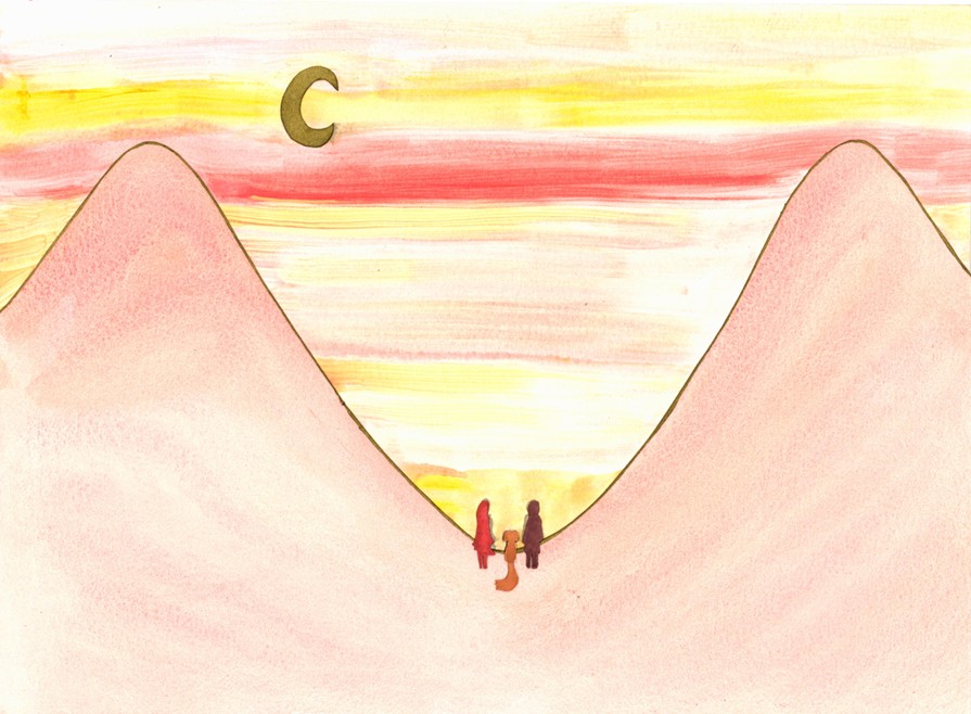 Een roedel wolven die om de beurt de heuvel op gaan en naar de maan huilen. Mixed media op papier, combinatie van waterverf, acrylverf, fineliner. 28*21cm.