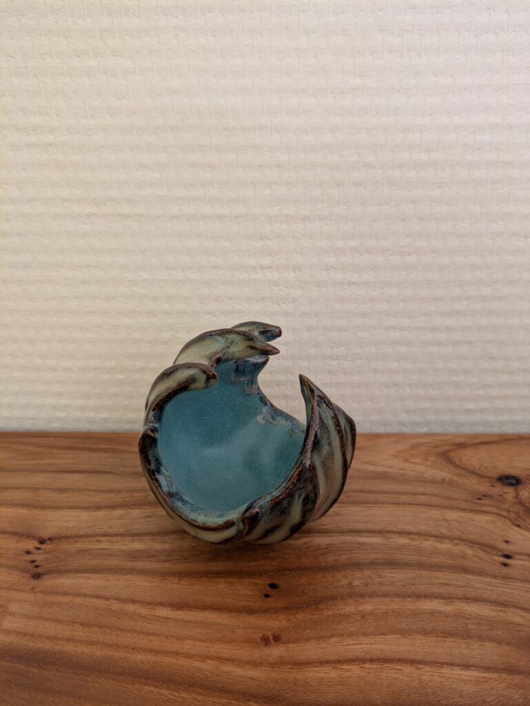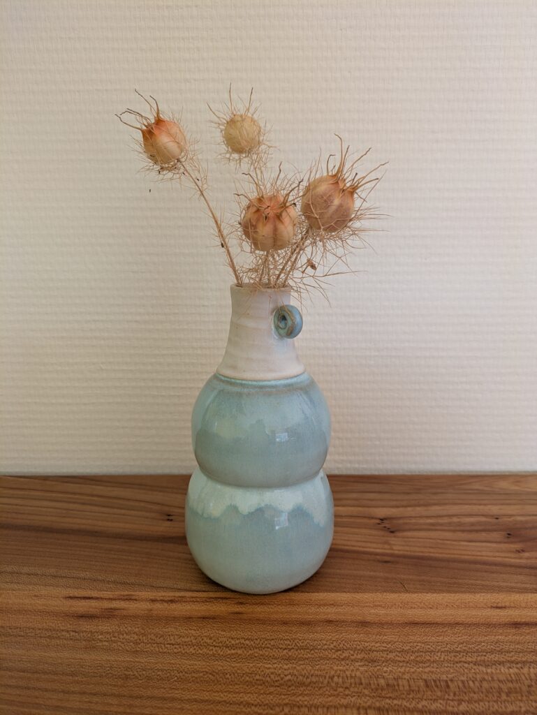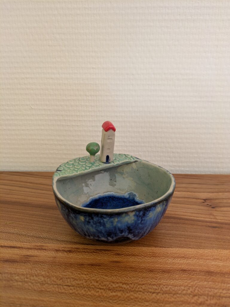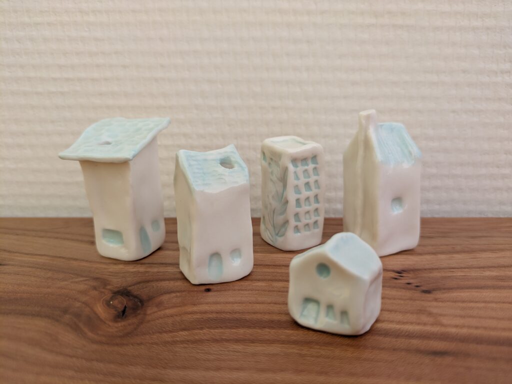 Porcelein is een wonderlijk materiaal voor mij, ik heb er nog niet veel mee gewerkt. Ik kan me verwonderen over hoe zacht het voelt, zowel tijdens het maken als nadat het gebakken is. Het is versteende kwetsbaarheid. Drie van deze huisjes zijn een mini vaasje, een heeft juist een gat onderin, zodat hij op een stok kan in de tuin.