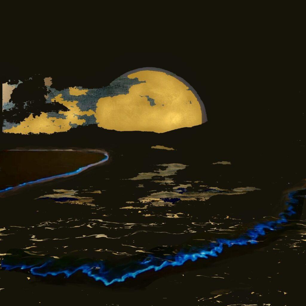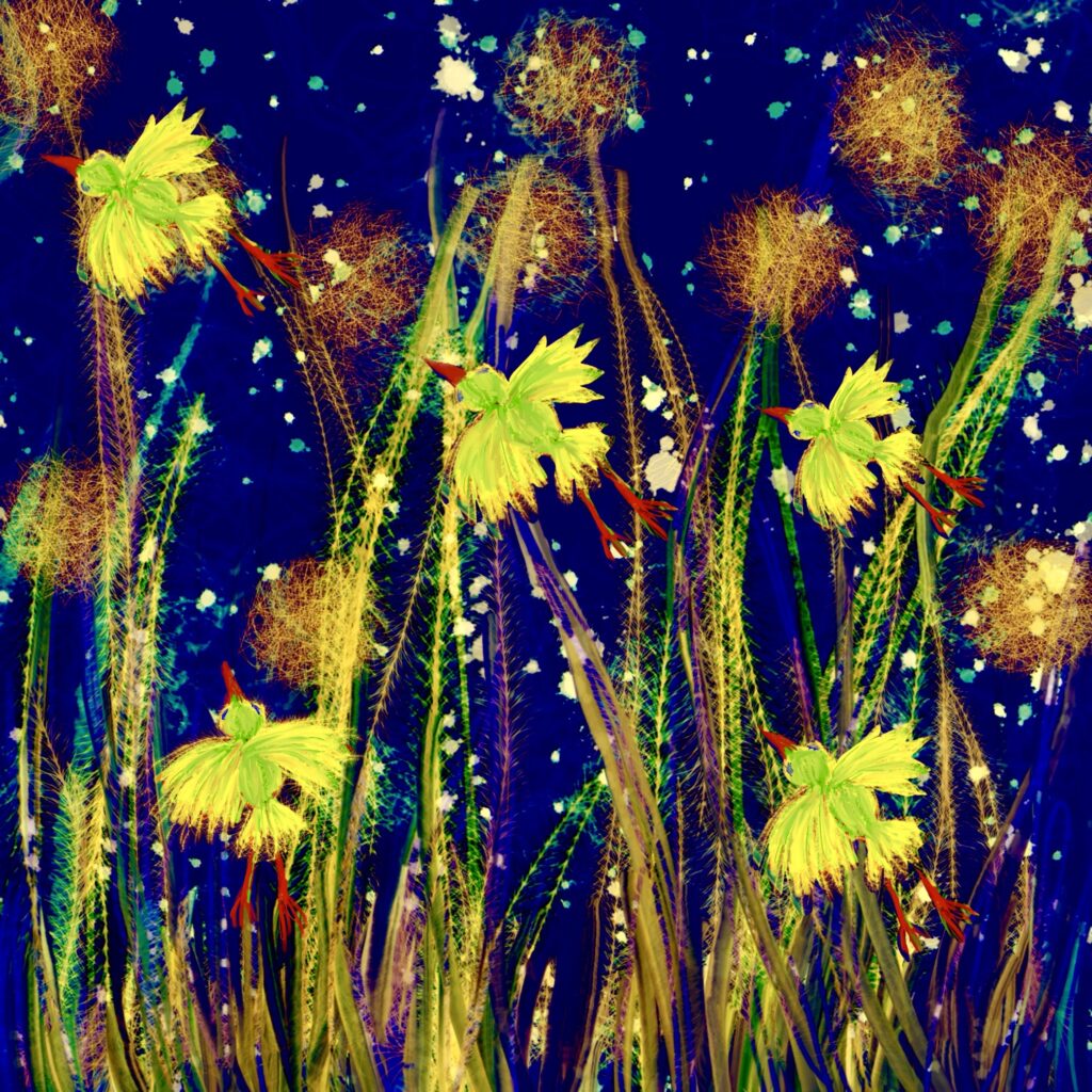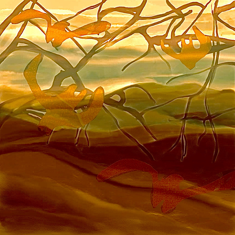 ‘WonderWereld’ is ontstaan door het samenvoegen van 3 van mijn digitale schilderijen: een landschap, boomtakken en vleermuizen.