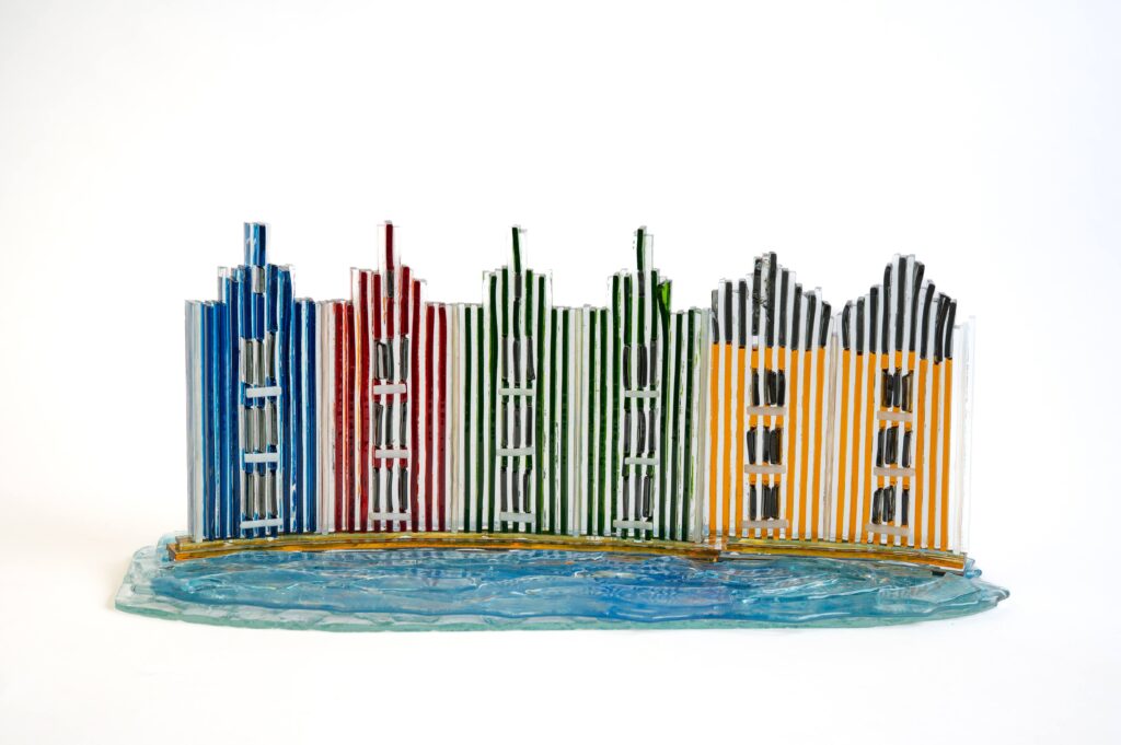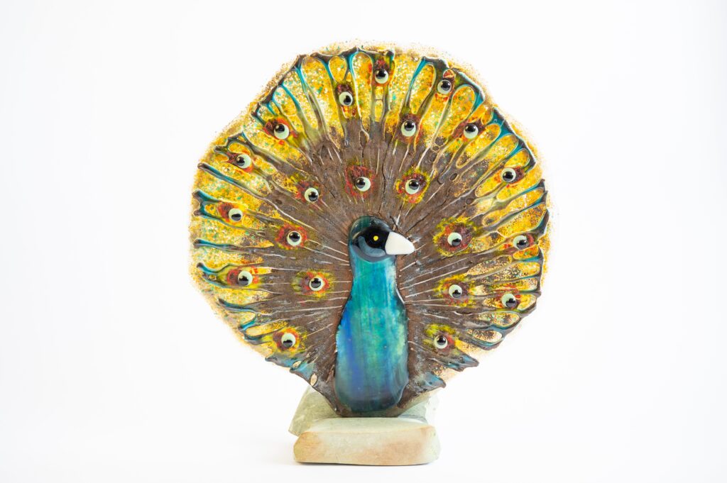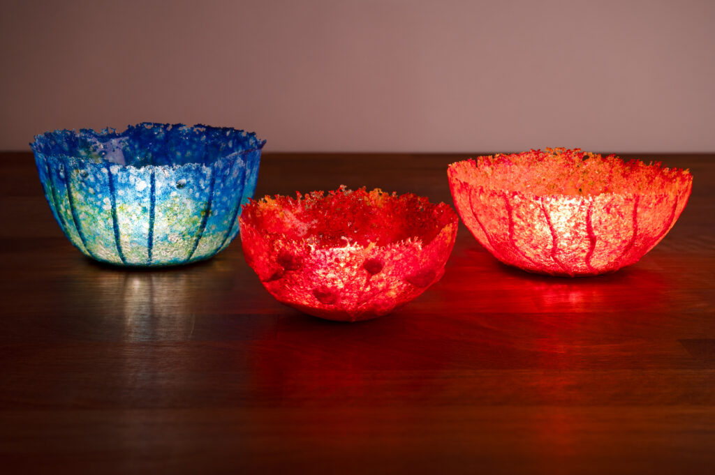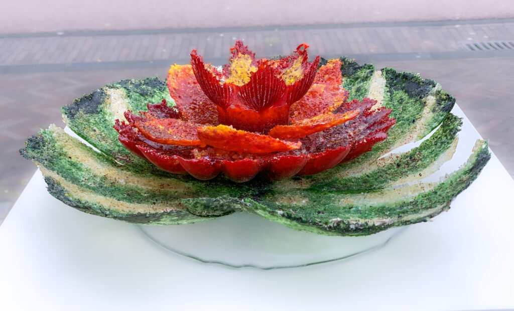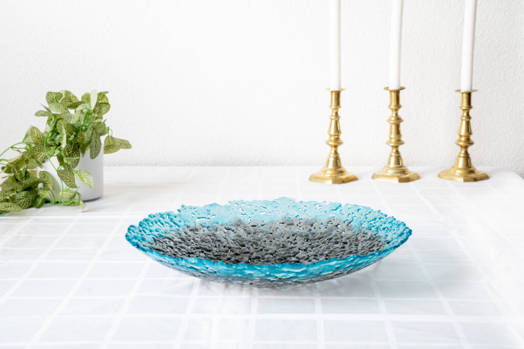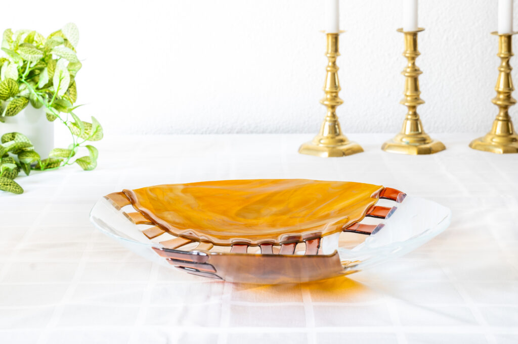 Deze schaal is gemaakt van recycled glas . Door dit glas in een mal te leggen als een mozaïek en te stoken in de glasoven ontstaat er een mooi effect.
