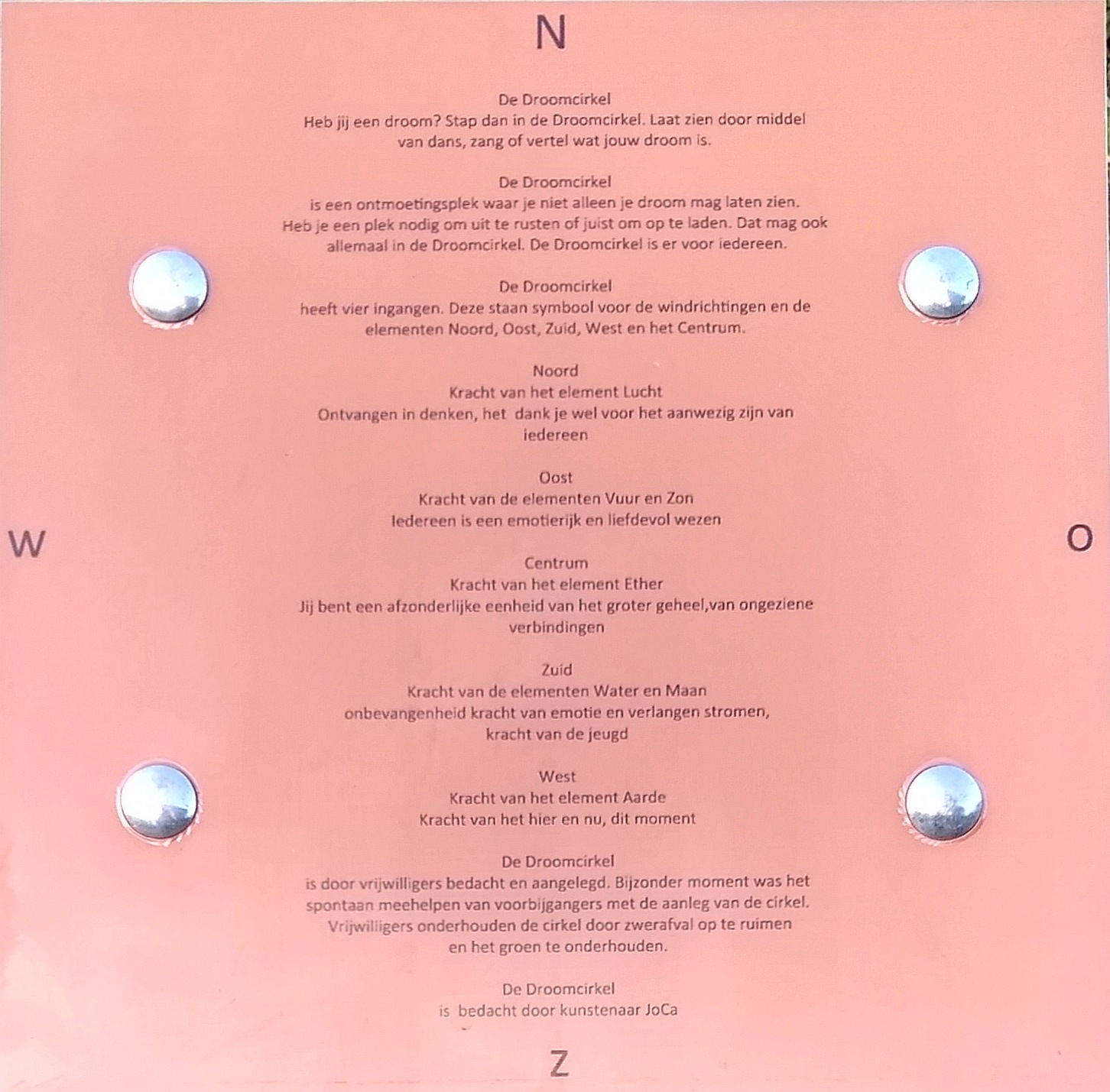 De Droomcirkel is bedoeld als ontmoetingsplek voor iedereen, om uit te rusten of juist op te laden. De Droomcirkel is door vrijwilligers aangelegd. Bijzonder was het spontaan meehelpen met de aanleg van de cirkel door toevallige voorbijgangers. De cirkel heeft vier ingangen die symbool staan voor de windrichtingen.
