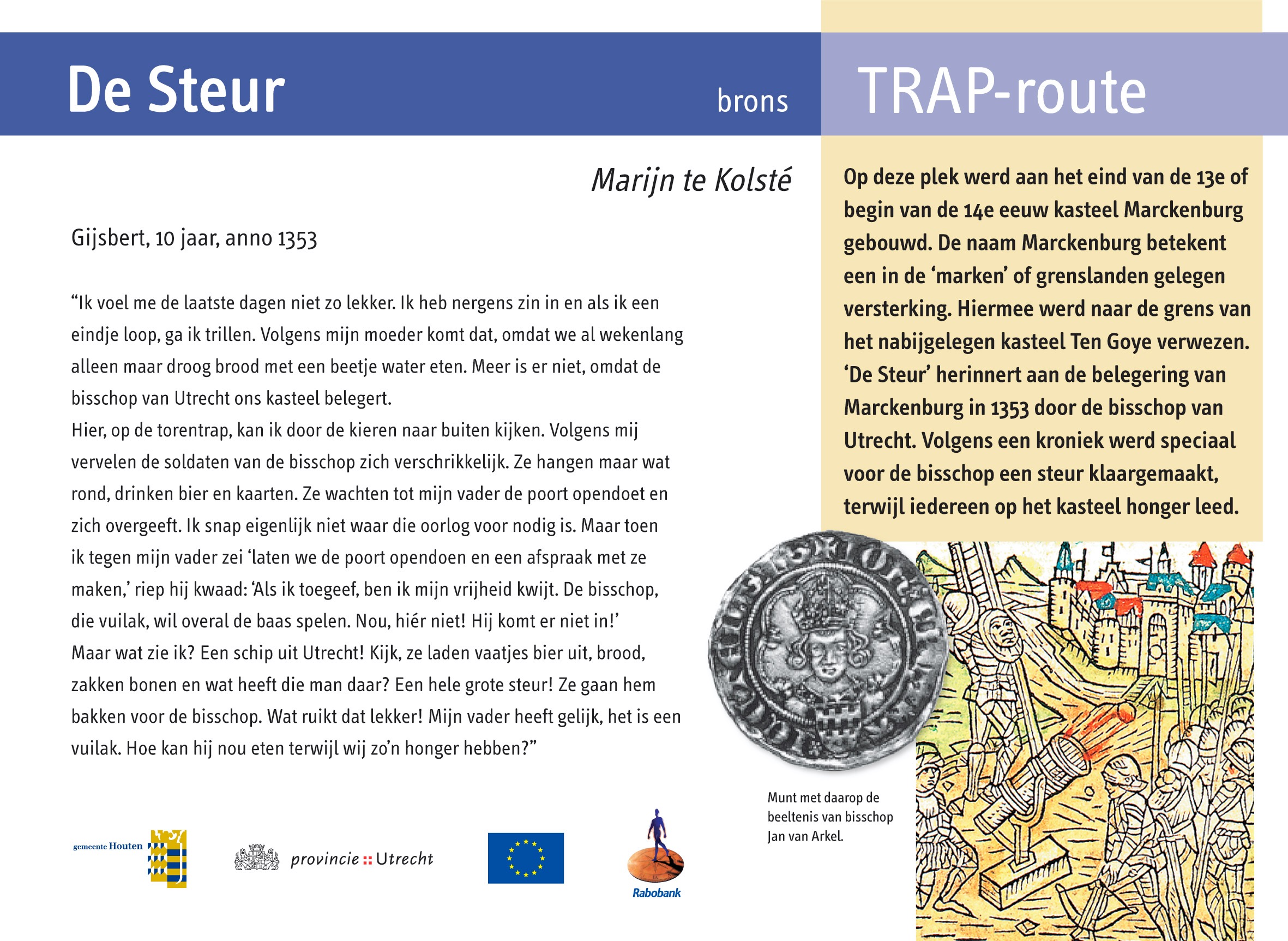 Hier stond eind 13e – begin 14e eeuw het kasteel Marckenburg. De naam betekent een in de ‘marken’ of grenslanden gelegen versterking. De steur herinnert aan de belegering van Marckenburg in 1353 door de bisschop van Utrecht, Jan van Arkel. Het verhaal gaat dat de bisschop een vis, de steur, liet aanvoeren en die lekker opat voor de ogen van de hongerige bewoners van het kasteel.