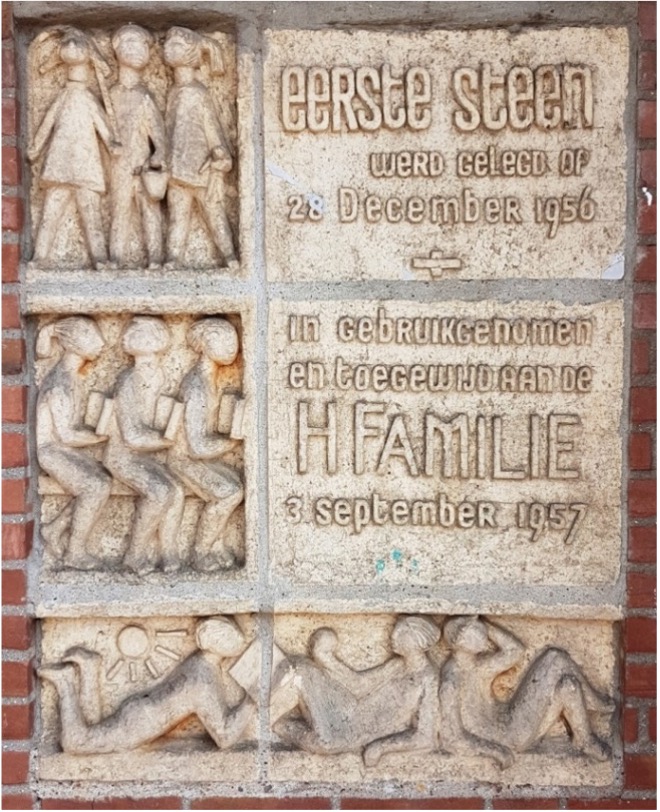 Deze muurplaquettes en muurschildering waren te zien op de Heilige Familie School. Deze school was een van de basisscholen in Houten voordat de expansie begon in de jaren 80 van de vorige eeuw. Sinds 2017 is de school opgegaan in de Van Harte School, ontstaan uit een samengaan van de Heilige Familieschool en de Bengelbongerd. Het oude schoolgebouw is inmiddels vervangen door een nieuw gebouw, geopend in oktober 2024.